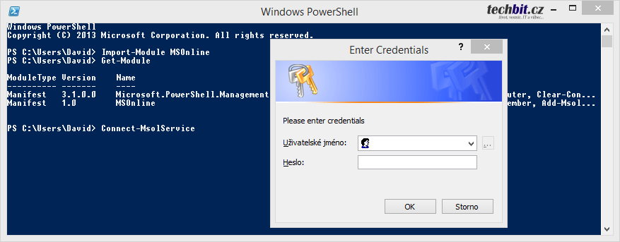 Následně zbývá jen se připojit pomocí Connect-MsolService a zadat pověřovací údaje.