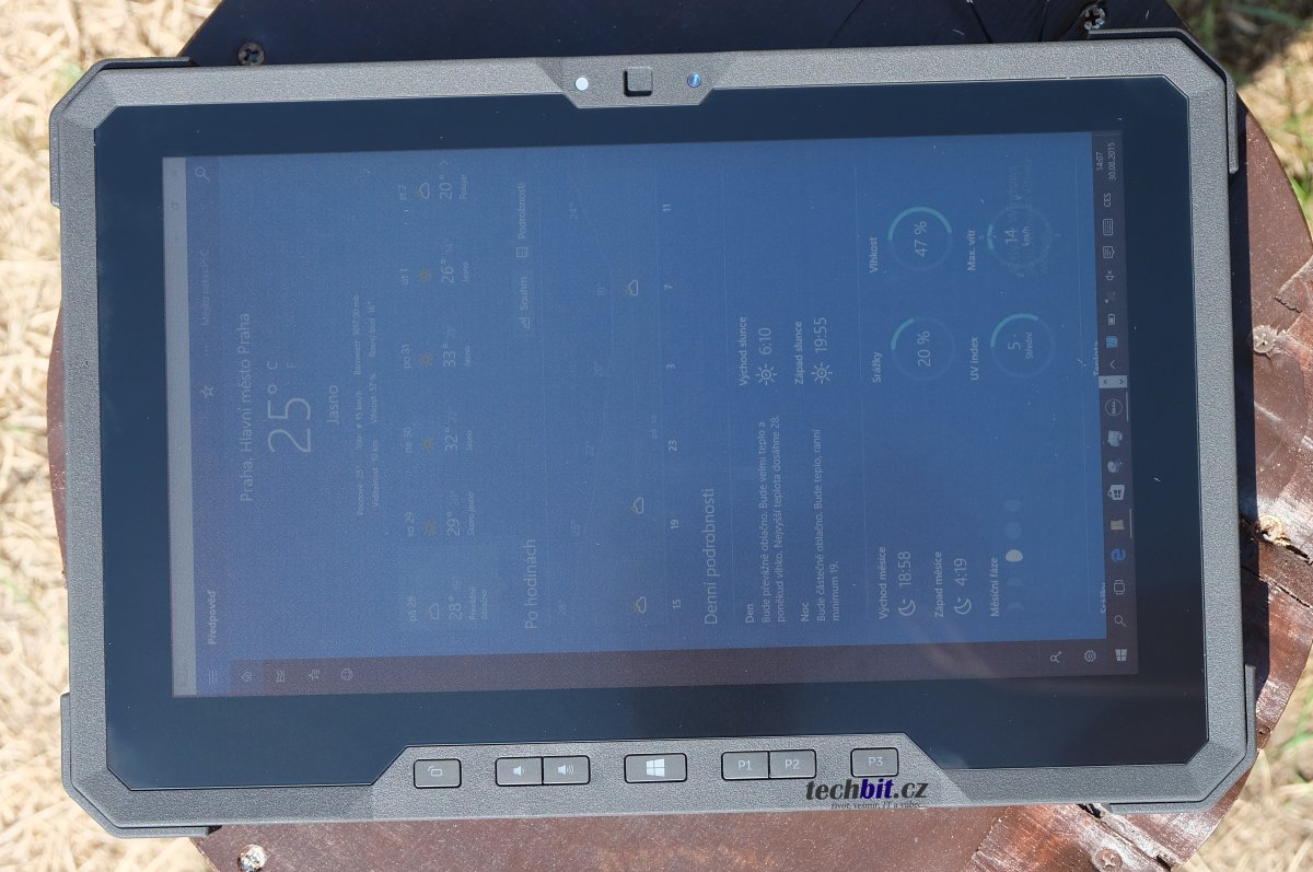 Tablet Rugged jsem ale neušetřil ostrému letnímu slunci, letos ostřejšímu než je obvykle. Na maximální jas byl displej celkem dobře čitelný a to i kolem poledne, kdy se slunce opravdu snažilo nejvíce mi práci znesnadnit. Maximální jas si ale vybírá celkem vysokou daň ve spotřebě a baterie ubývá téměř před očima. Takže na sluníčku to není na extra dlouhou práci. Naopak ve tmě lze displej opravdu hodně ztmavit, řekl bych, že více než je obvyklé, a prodloužit tím výrazně výdrž baterií (jsou tam dvě). Ve tmě může zachránit LED, dokáže opravdu slušně svítit.
