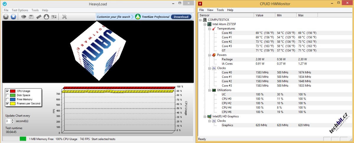Při pohledu na hardware to není nic neobvyklého. Poslední dva moje články o tabletech (Lenovo Miix 3-830 a Miix 3-1030) mají základ s Compute Stickem totožný – Bay Trail-CR. Rozdíl je tedy hlavně ve velikosti. Vše se vešlo do miniaturního těla. Protože jsem už pár zařízení na platformě Bay Trail-CR měl v ruce, vím, že při zátěži celkem topí. Proto má Intel Compute Stick chlazení řešeno aktivně. Malý, opravdu malý ventilátor. Když točí plné otáčky a je v místnosti ticho, uslyšíte ho. Není to ale nic tragického, alespoň pro mě. Trochu jsem si s tím hrál, zatížil Compute Stick na maximum a čekal na kolik vyleze teplota. Hrál pro mě i fakt, že byl velmi horký letní den. 73°C bylo maximum. Pro zajímavost – maximální operační teplota pro CPU Intel Atom Z3735F je 90°C, ale to bych raději už nezkoušel.