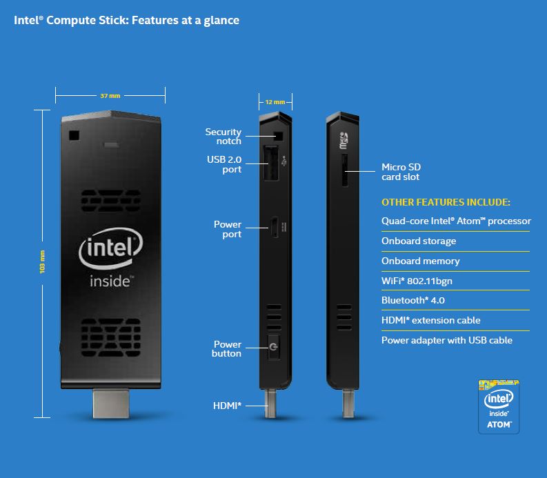 Compute Stick patří do kategorie malých počítačů, které se zapojují přímo do TV nebo monitoru. Jednoduše řečeno, nemají tradiční výstup grafické karty, ale rovnou konektor – obvykle HDMI. Nabízí se použít Compute Stick třeba ke starším TV, které se ještě nehonosí přívlastkem „Smart“. Compute Stick pak z takové TV udělá více než chytrou TV s Windows nebo Ubuntu (Prodává se verze s Linuxem, konkrétně s Ubuntu 14.04 LTS, která má 1GB operační paměti a vnitřní úložiště o velikosti 8GB). S připojením k TV a použitím Intel Compute Sticku pro multimédia to ale není tak jednoduché. Rozepíši na dalších řádcích. Primárně je Intel Compute Stick určen pro byznys – kancelář, tenký klient, přenosné PC nebo při nedostatku místa pro umístění PC.