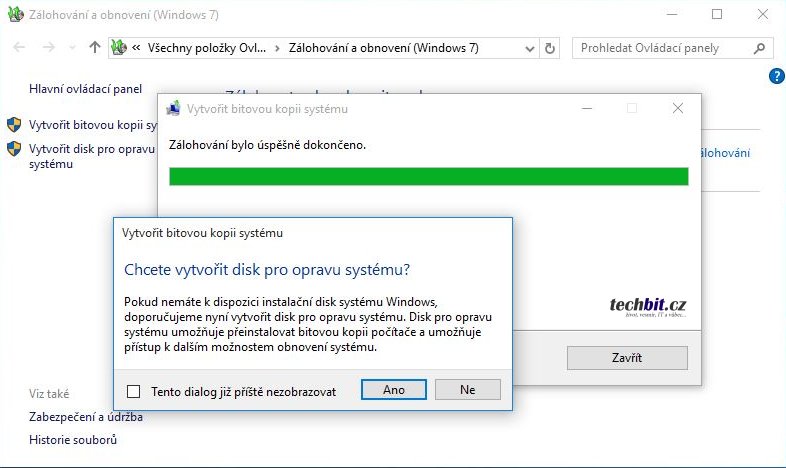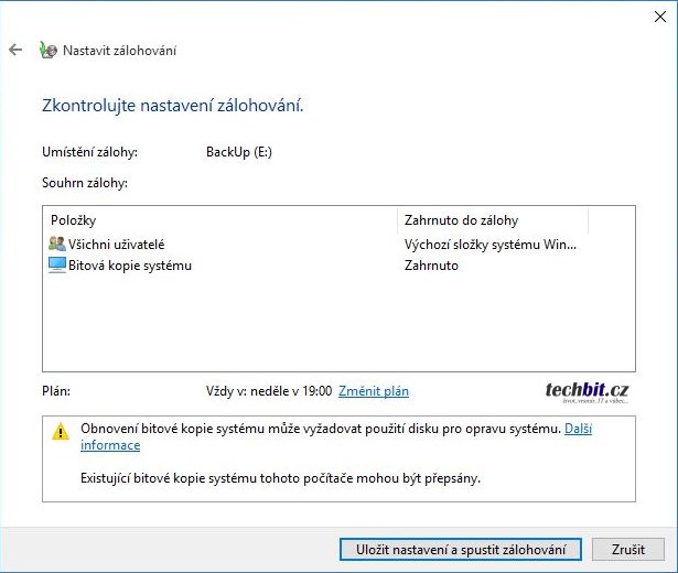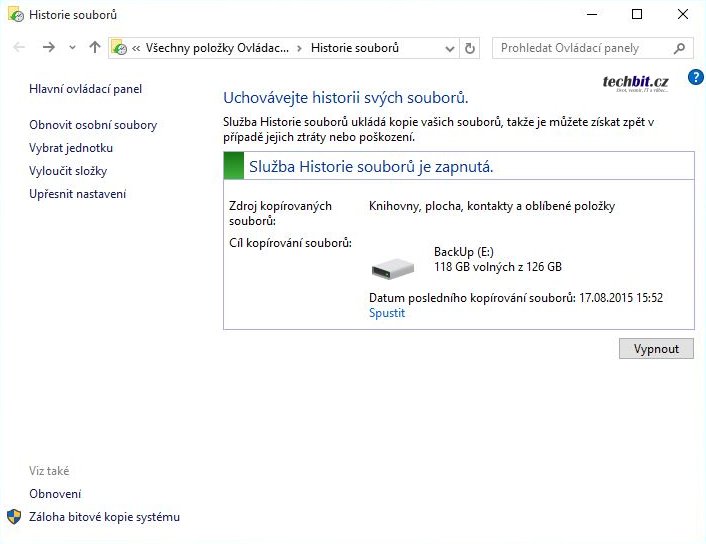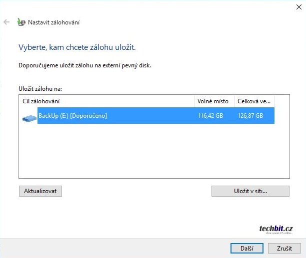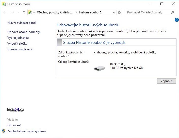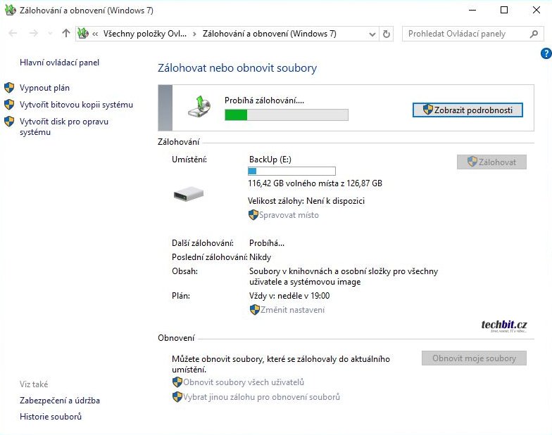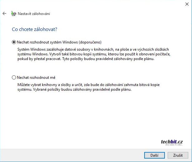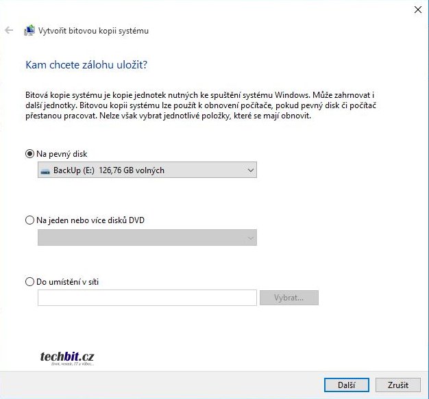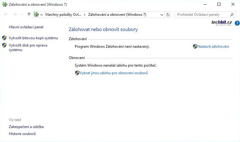 Teď jsou dvě možnosti – zálohovat jednorázově bitovou kopii systému (Vytvořit bitovou kopii systému) nebo nastavit pravidelné zálohování (Nastavit zálohování). Při pravidelném zálohování lze do zálohy zahrnout i aktuální bitovou kopii systému. Je tedy na Vás, co budete preferovat. Pro pravidelné zálohování se dá také použít funkce Historie souborů (nezahrnuje bitovou kopii systému).