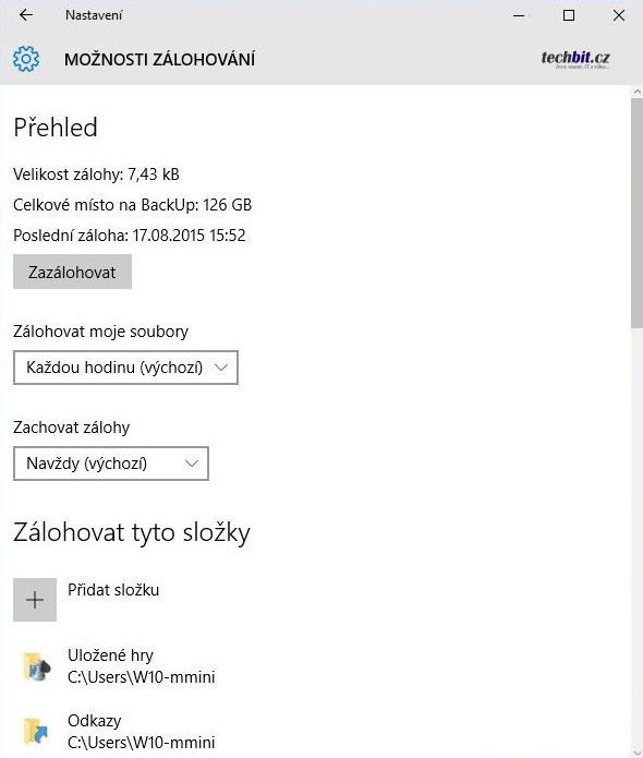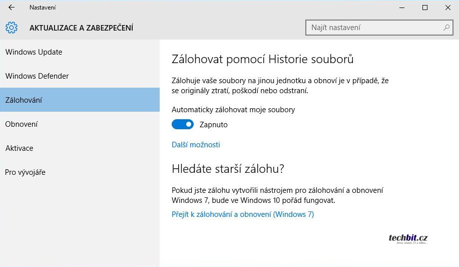 Nově lze funkci Historie souborů spravovat v nastavení Windows 10. Když otevřete Nastavení a Aktualizace a zabezpečení, uvidíte v menu Zálohování. Prakticky jsou to stejné možnosti jako v klasickém rozhraní, ale pokud bude třeba nastavit něco více nebo obnovovat data, odkáže Vás to zpět do klasického nastavení v ovládacích panelech.