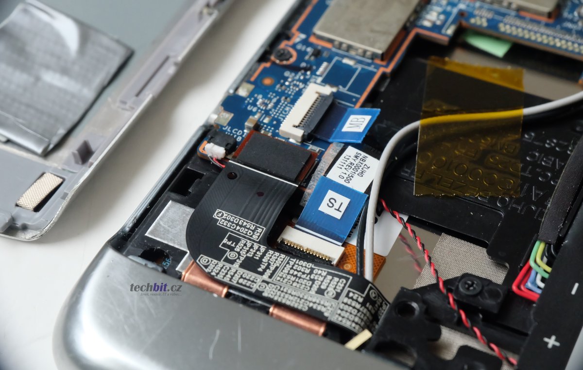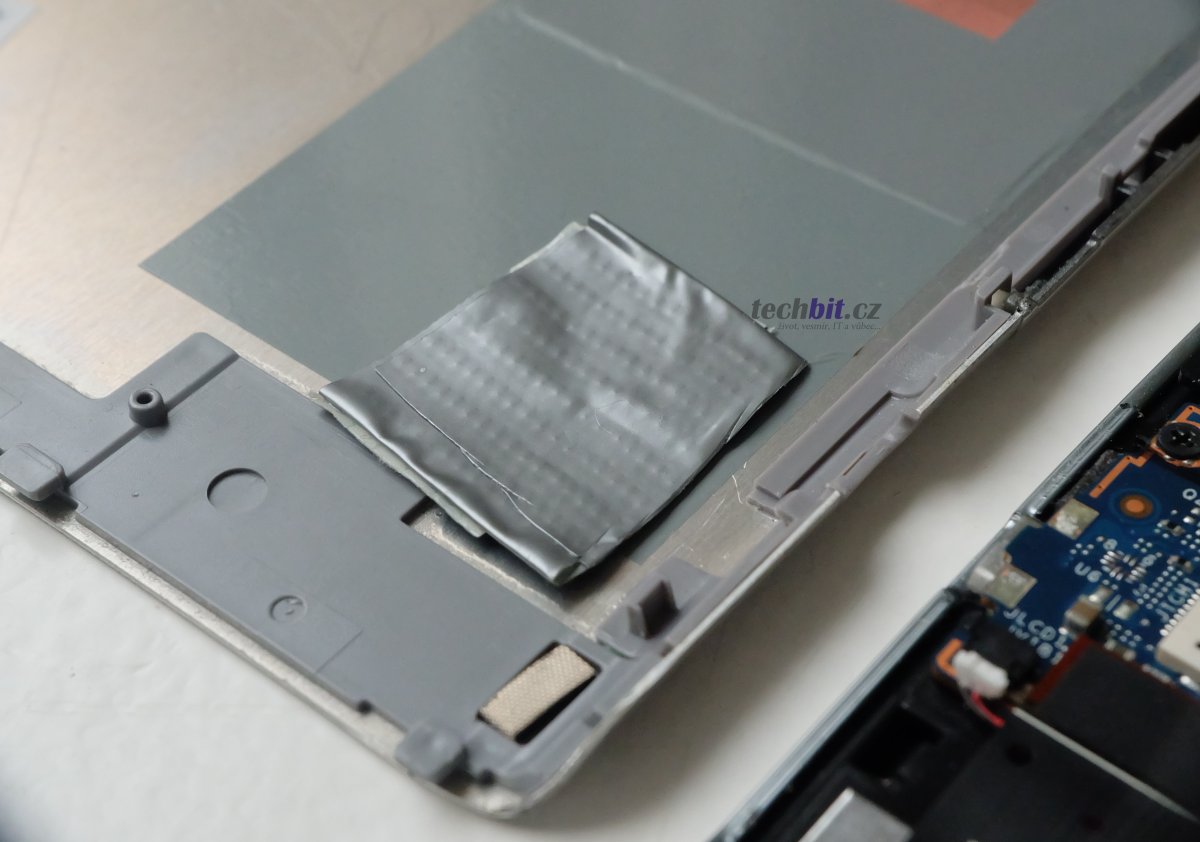 Při rozebírání tabletu si dejte pozor na ty prokleté plastové zobáčky, snadno se lámou. Ale jinak je sundání zadního krytu tabletu hračka. Všechna propojení, která mají něco společného s displejem, jsou v jednom rohu tabletu. Takže snadno k nalezení. Doporučuji je, stejně jako na videu, odpojit / připojit. Pak je třeba zajistit, aby na konektory (zvláště ten největší) byly trochu pod tlakem. Tedy přimáčknuty k základní desce. Můžete si klidně vymyslet nějaké své, lepší řešení. Já použil asi tři vrstvy izolační lepicí pásky umístěné do zadního krytu tabletu a stačilo to.