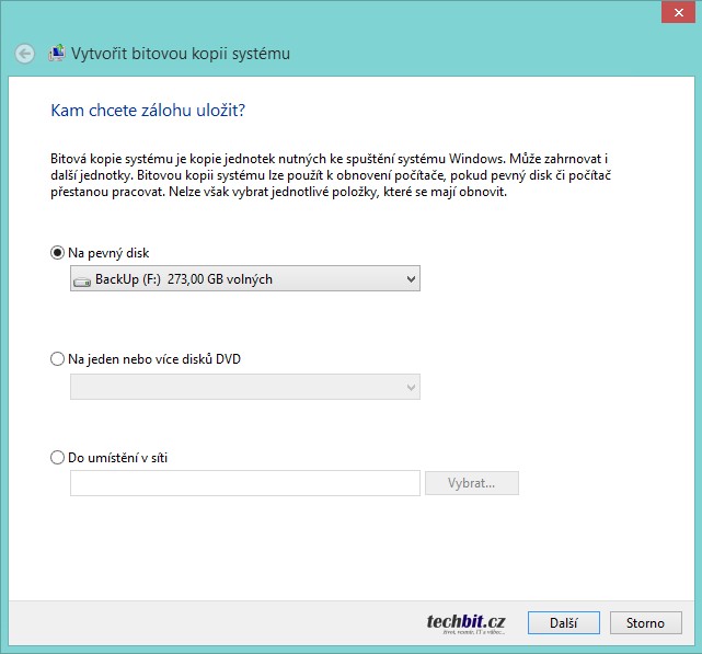 Nejdříve je třeba se rozhodnout, kam zálohu umístit. Externí disk, síťové umístění, optický disk DVD (bude jich potřeba více). V následujících příkladech volím externí disk.