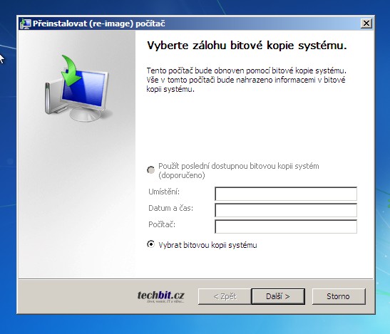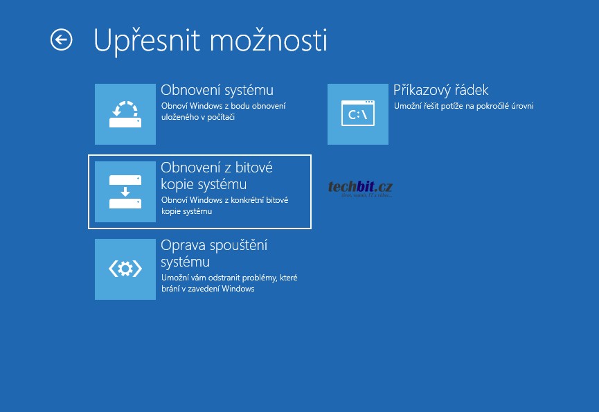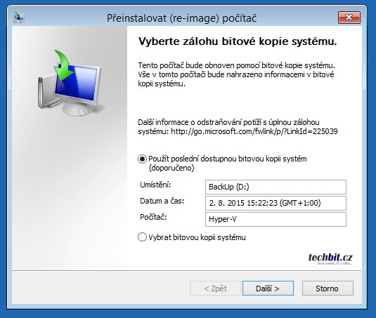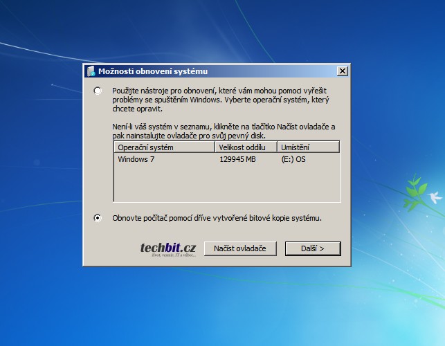 Další možnost je obnova pomocí instalačního média Windows 7/8 nebo opravného disku Windows. Nastartujte své zařízení ze zmíněného disku a mějte připravenou zálohu tak, aby k ní zařízení mělo přístup. Nejlépe na připojeném externím disku. Na první obrazovce zvolíte jazyk, rozložení klávesnice a na další je již volba Opravit počítač. Zbývá se proklikat až k možnosti obnovení z bitové kopie systému.