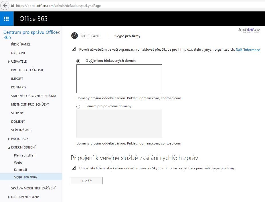 V centru pro správu Office 365 přejděte do nastavení externí sdílení > Skype pro firmy a možnost komunikace s kontakty mimo organizaci jednoduše povolit. Lze ještě určit, zda se může komunikovat jen s povolenými doménami nebo jen určité blokovat. Uvedené nastavení se týká jen Skype pro firmy. Pro komunikaci s obyčejným Skype je třeba povolit poslední volbu. Nastavení lze také provést přes správce > Skype pro firmy. Samozřejmě to jde také přes PowerShell, popíši v nějakém dalším článku.