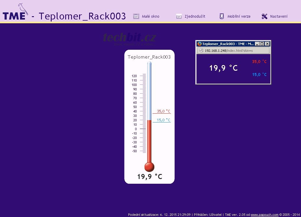 Správa síťového teploměru probíhá samozřejmě přes webový prohlížeč. Nejprve je třeba přes jednoduchý nástroj zařízení na síti vyhledat a nastavit mu vhodnou IP adresu. Ve webovém rozhraní na první obrazovce ihned zobrazuje aktuální teplotu. Vzhled teploměru si lze různě přizpůsobit – například pro mobilní zařízení nebo jen samotná informace zobrazené v malém okně.