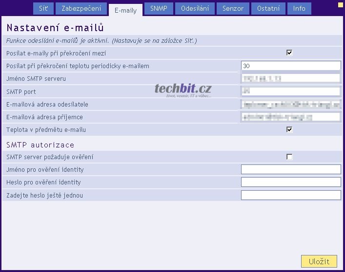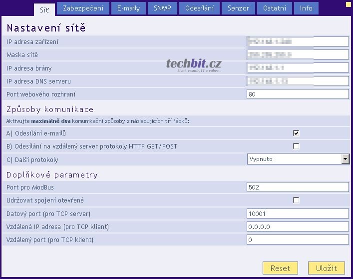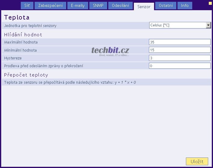Přístup do konfigurace teploměru je dobré zabezpečit heslem. A to hlavní, nastavení hlídání teploty. Lze nastavit minimální a maximální hodnoty, při jejichž překročení může odesílat upozornění. Komunikační možnosti jsou široké, mimo webu například: XML, HTTP GET, HTTP POST, e-mail, SNMP protokol, MODBUS TCP protokol.