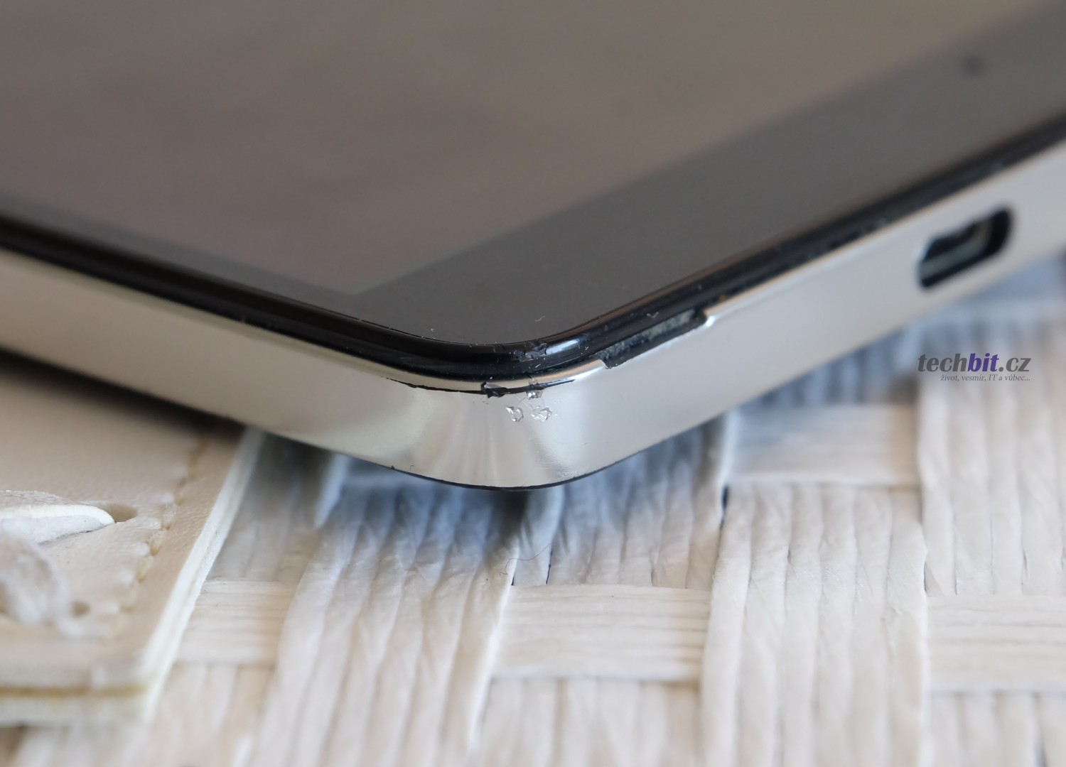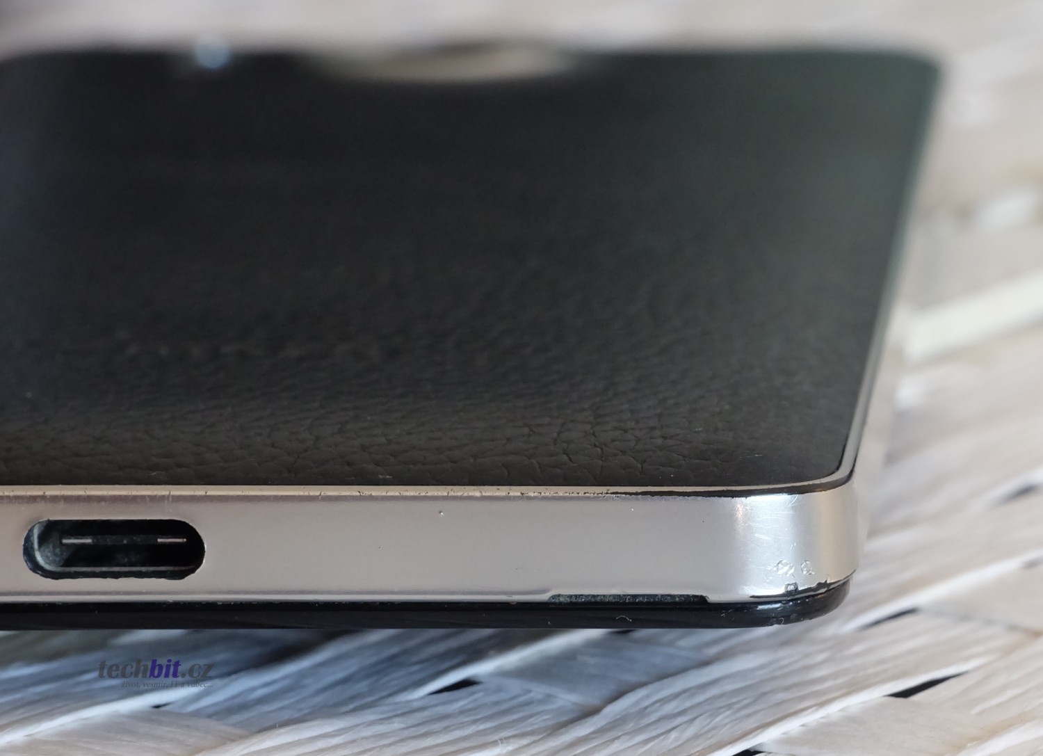 Povrch kůže nese známky používání, v rozích a na okraji je ošoupaná tak, až skoro mizí její perforace. Řekl bych nic neobvyklého. Důležité je, že kůže nikde nevylézá a neodlupuje se. Stále drží, jak má. Na makro fotkách může být mírně patrné, že kůže má tendenci vylézat z rámečku, ale okem to viditelné není. Na kůži je pár šrámů, za které si mohu svou neopatrností sám. Ale i tak kryt vypadá pořád dobře.