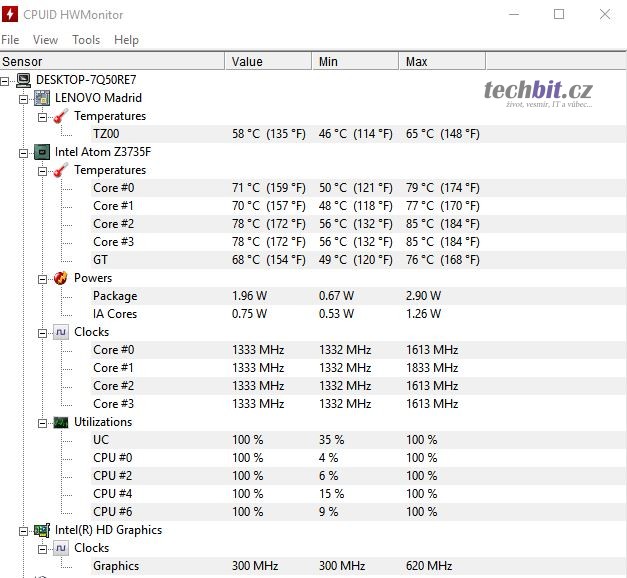 Stále platí, že při 100% zátěži bude tablet docela hřát. Jak již víme, platforma Bay Trail-CR prostě topí. Na ruce je to ale znatelně příjemnější, než u předchozího modelu. Tedy nepálí, jen hřeje. Na plný výkon ho ale bude trápit málokdo, tento tablet je už ze své podstaty určen pro nenáročnou práci.