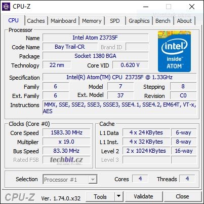 CPU: Intel Atom Z3735F 1.33GHz, turbo 1.83 GHz, 2 MB L2 Cache