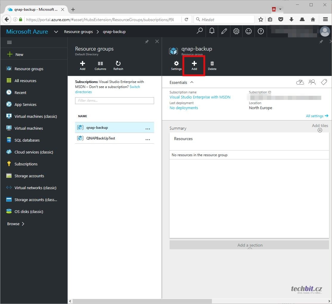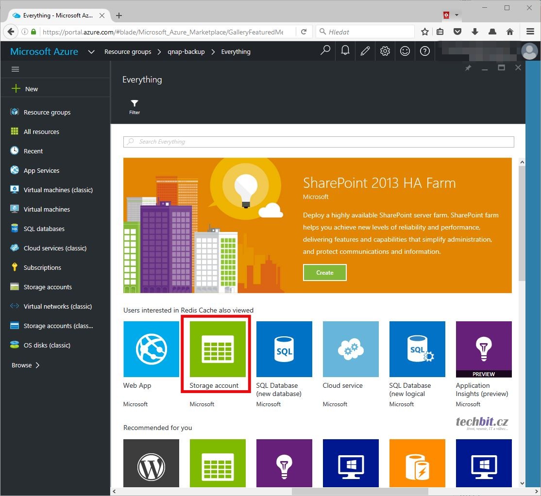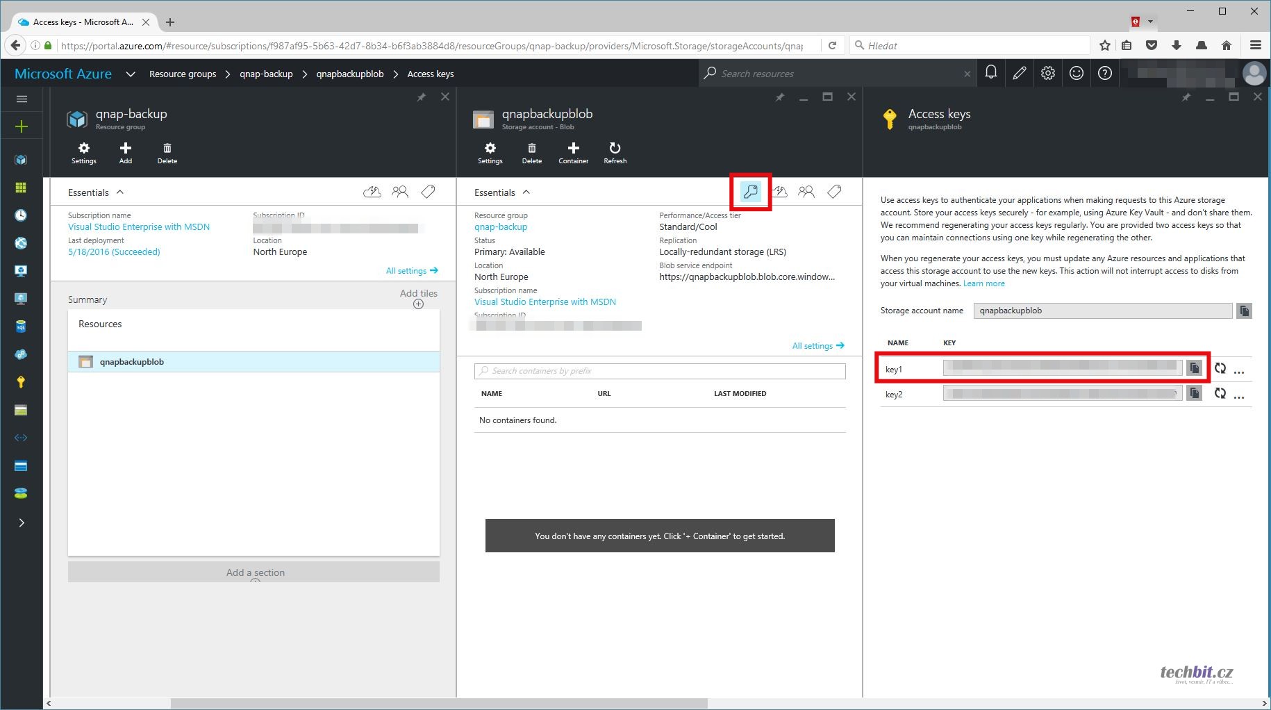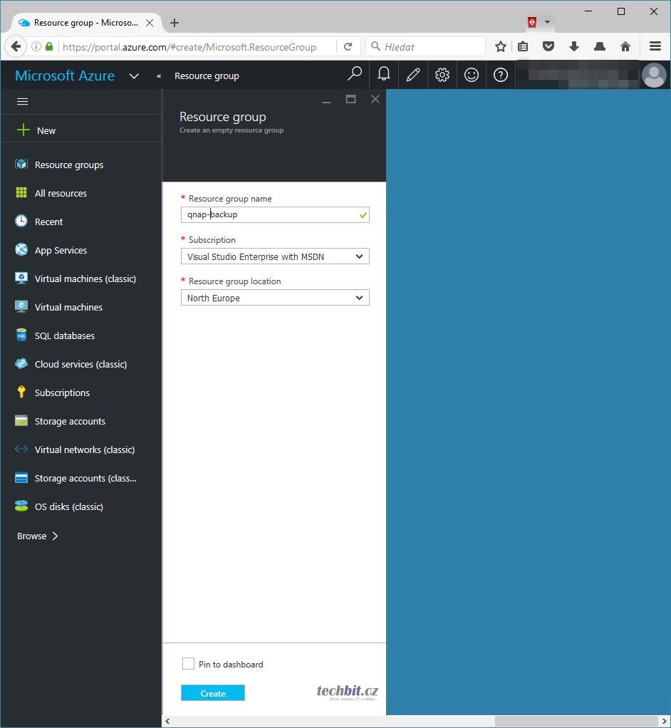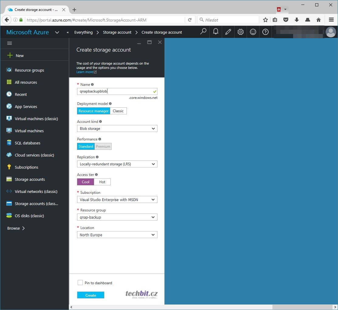 Otevřete si vytvořenou skupinu a přidejte službu (Add). Vyhledejte Storage account. Vytvořte si úložiště. V Account kind zvolte Blob storage, ten pro účel ukládání záloh stačí. Po vytvoření úložiště bude třeba již jen klíč pro přístup. Ten získáte v nastavení svého blobu v Access keys nebo jednoduše kliknutím na ikonku klíče. To je z Azure zatím vše a můžete se pustit do konfigurace QNAPu.