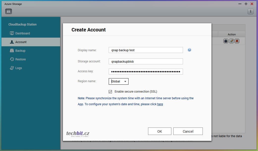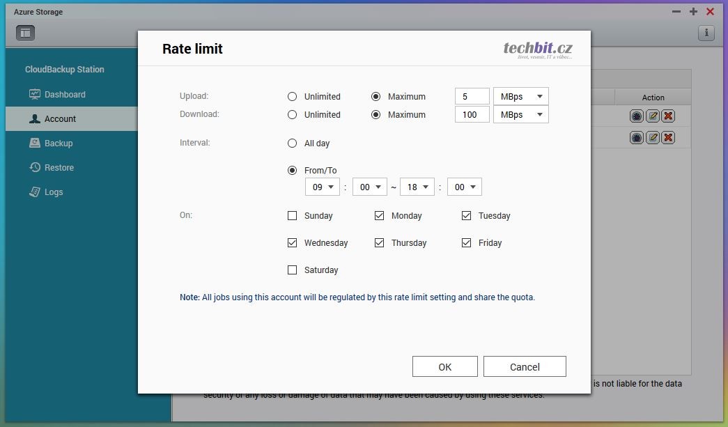Po přihlášení do administrace QNAPu si z v AppCenter najděte aplikaci Azure Storage, nainstalujte ji a otevřete. V aplikaci přejděte na Account a vytvořte účet. Tady bude třeba vložit název úložiště (blobu) a přístupový klíč. Ten najdete podle předchozí kapitoly. V nastavení účtu můžete říct, jak a kdy může zálohování internetovou linku využívat.