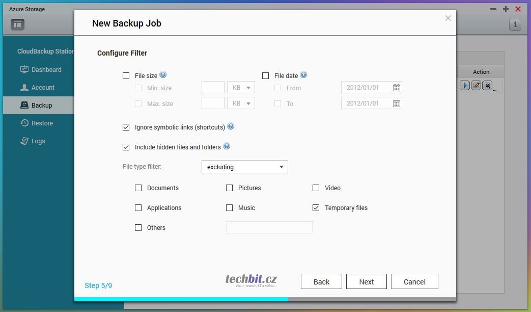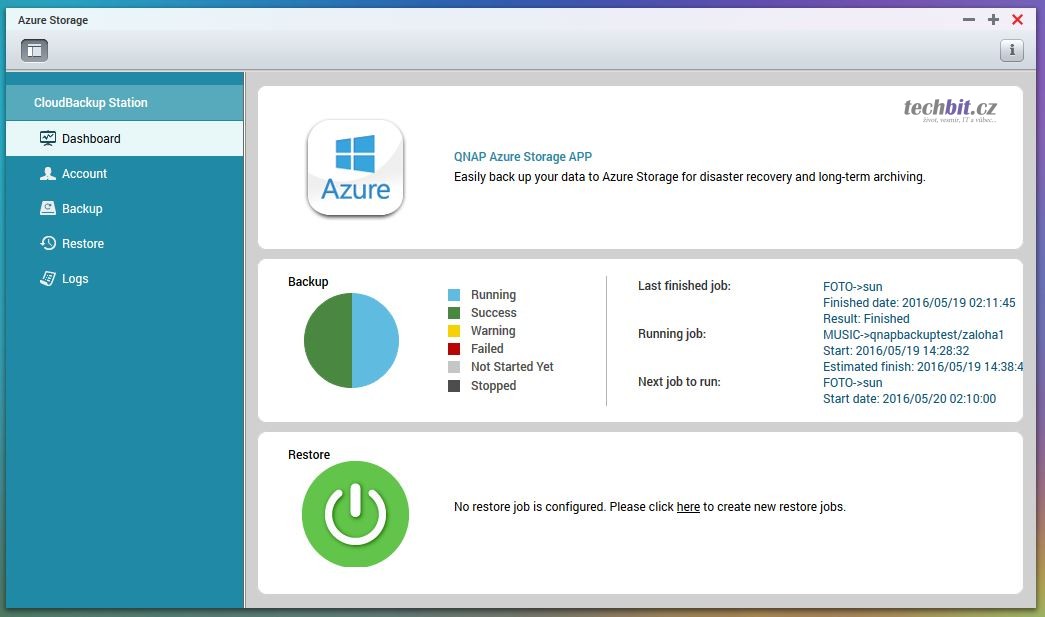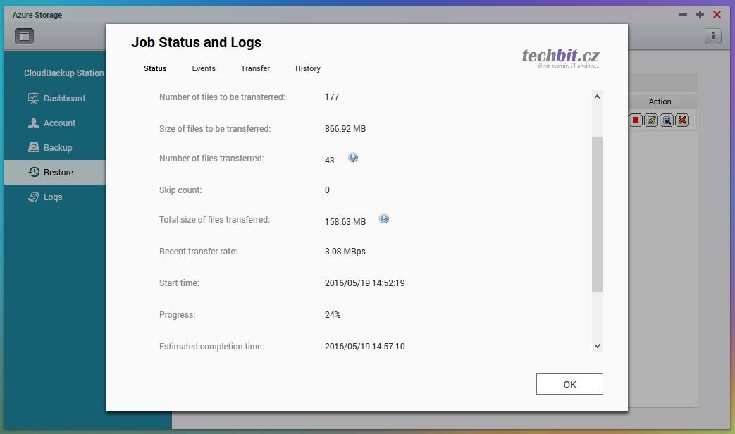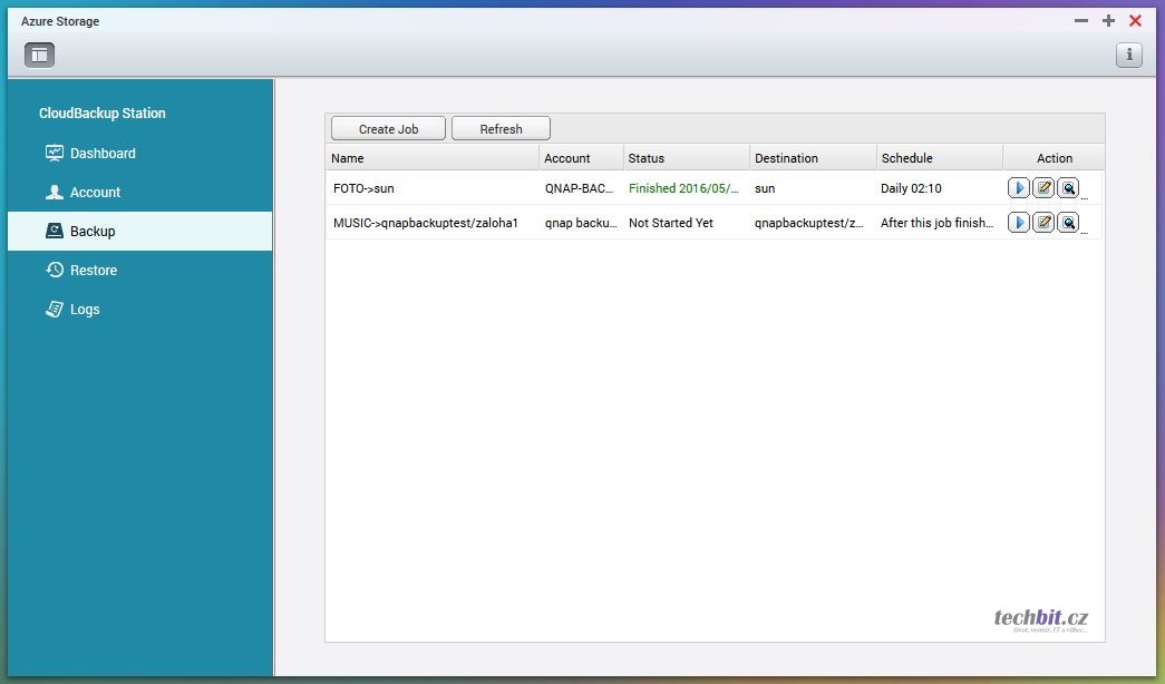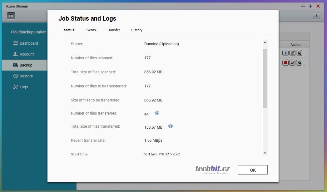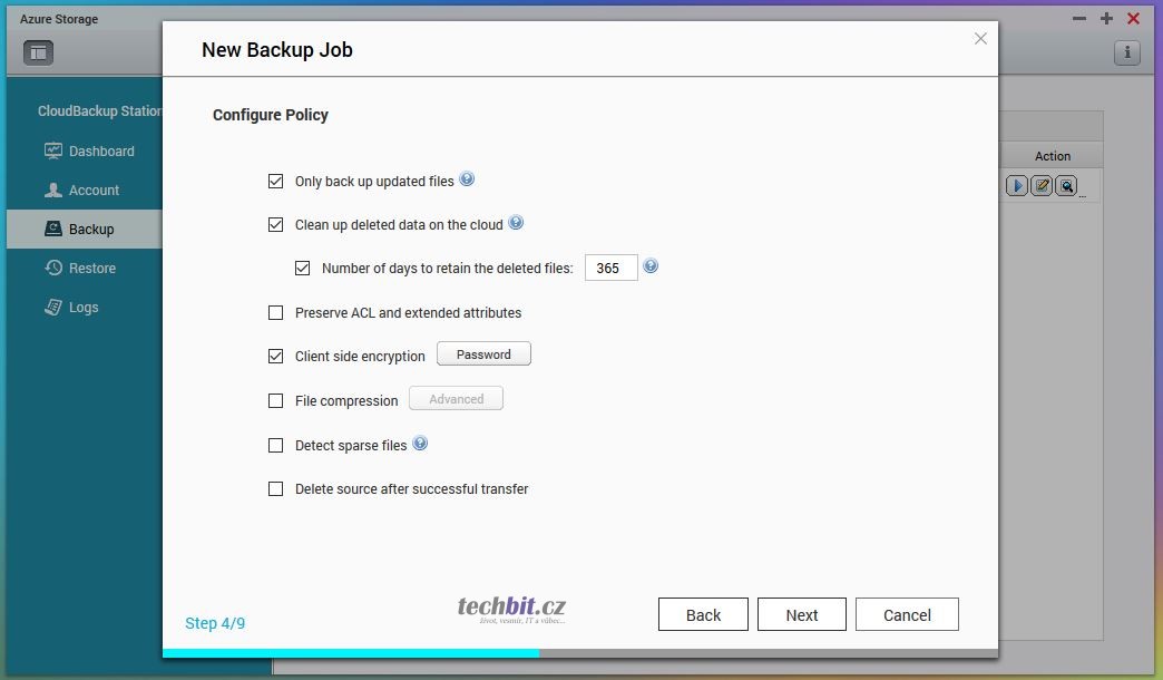 Teď můžete vytvořit úlohu pro zálohování. V menu přejděte na Backup, pak Create Job a projít si průvodce. Úloha se může spouštět až 4x denně, ručně, jednou v naplánovaný čas nebo po dokončení jiné úlohy. Důležitým krokem při vytváření úlohy je šifrování. Rozhodně doporučuji data šifrovat. Šifrovací klíč samozřejmě nesmíte ztratit, jinak se ke svým zálohovaným datům již nedostanete. Místo v úložišti můžete šetřit komprimací dat. V jednom z dalších kroků vytváříte kontejner a složku pro umístění zálohy – Container name a Folder name. Šikovná je možnost nastavit si upozornění při dosažení určité velikosti zálohovaných dat v úložišti. Po dokončení průvodce můžete úlohu rovnou spustit a sledovat její průběh.