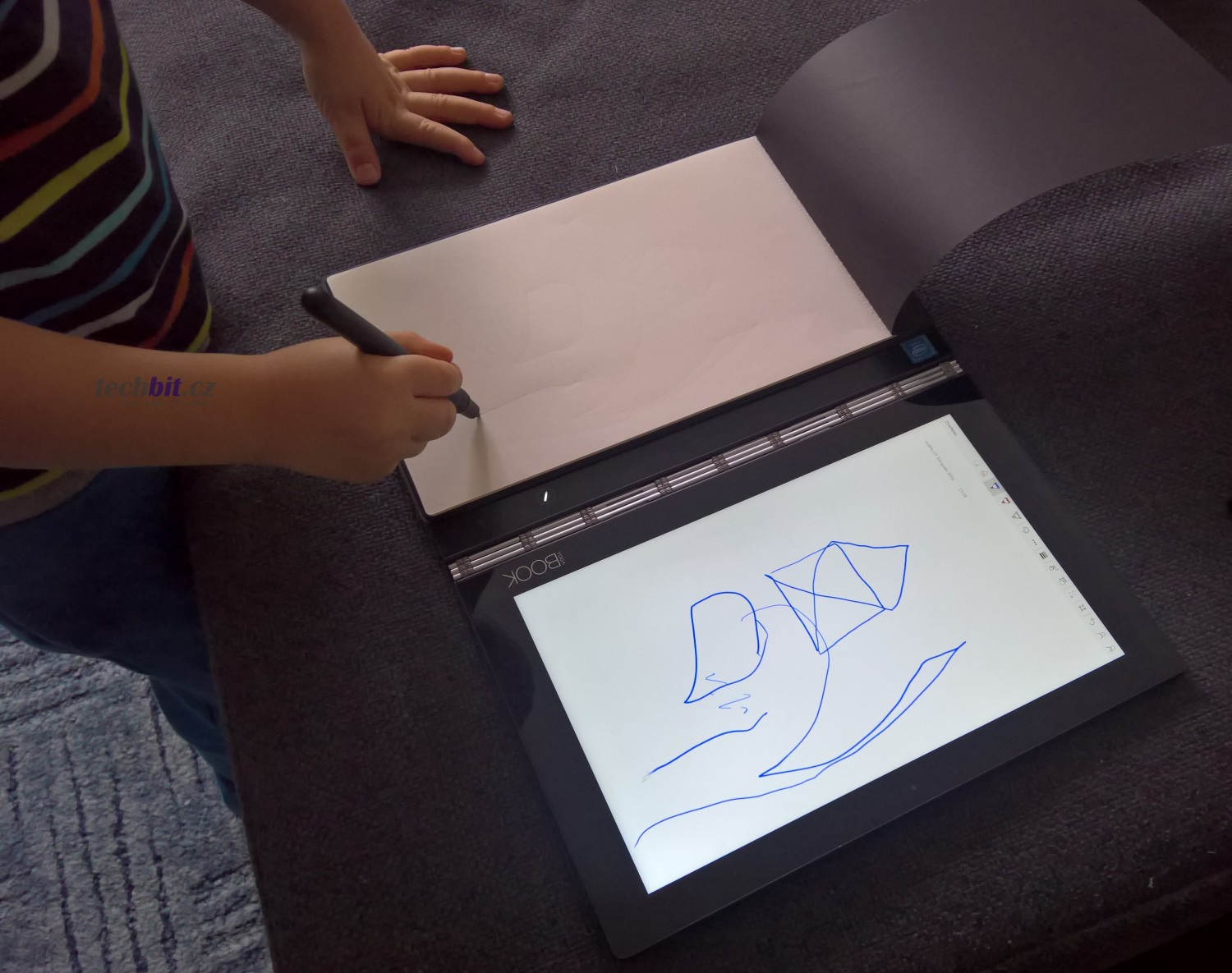 Primárně je Yoga Book určen pro použití se stylusovým perem, které je součástí balení. S ním už velká plocha dává smysl. Kdo chce kreslit a nechce investovat balík do nějakého profi zařízení, může si s Yoga Bookem rozumět. Další využití je ruční psaní poznámek současně na papír a digitálně například do OneNote. Tento nápad se mi velmi zamlouvá – uchytíte si na dotykovou podložku blok, který drží přesně díky magnetům. A můžete psát pomocí pera, které tedy nejdříve musíte naplnit inkoustem. Poznámky píšete tedy zároveň na papír a rovnou do OneNote. Speciální papír lze dokoupit a jeden list vychází cca na 4 koruny (Yoga Book Pad Paper). Já rukou nepíši, ale pro spoustu lidí to může být moc fajn.