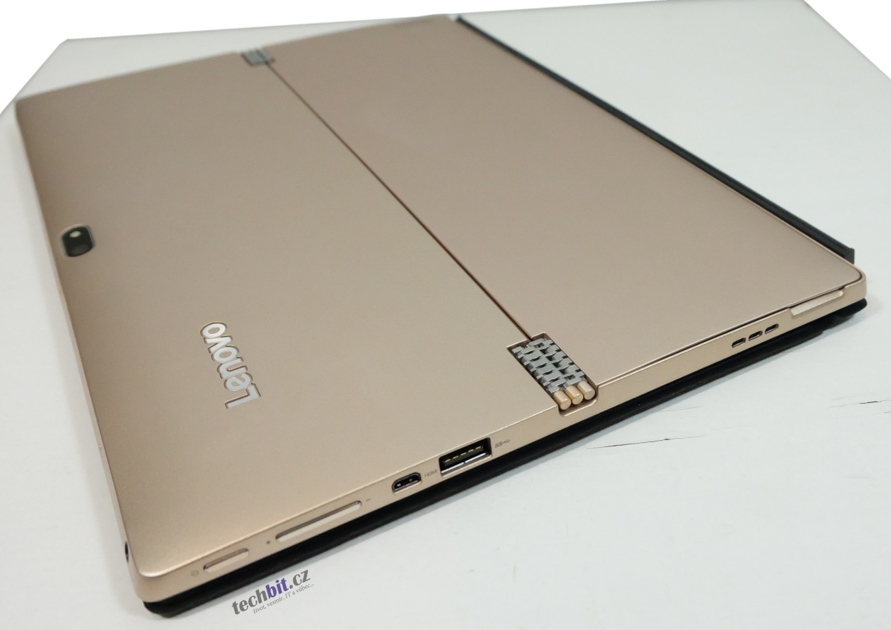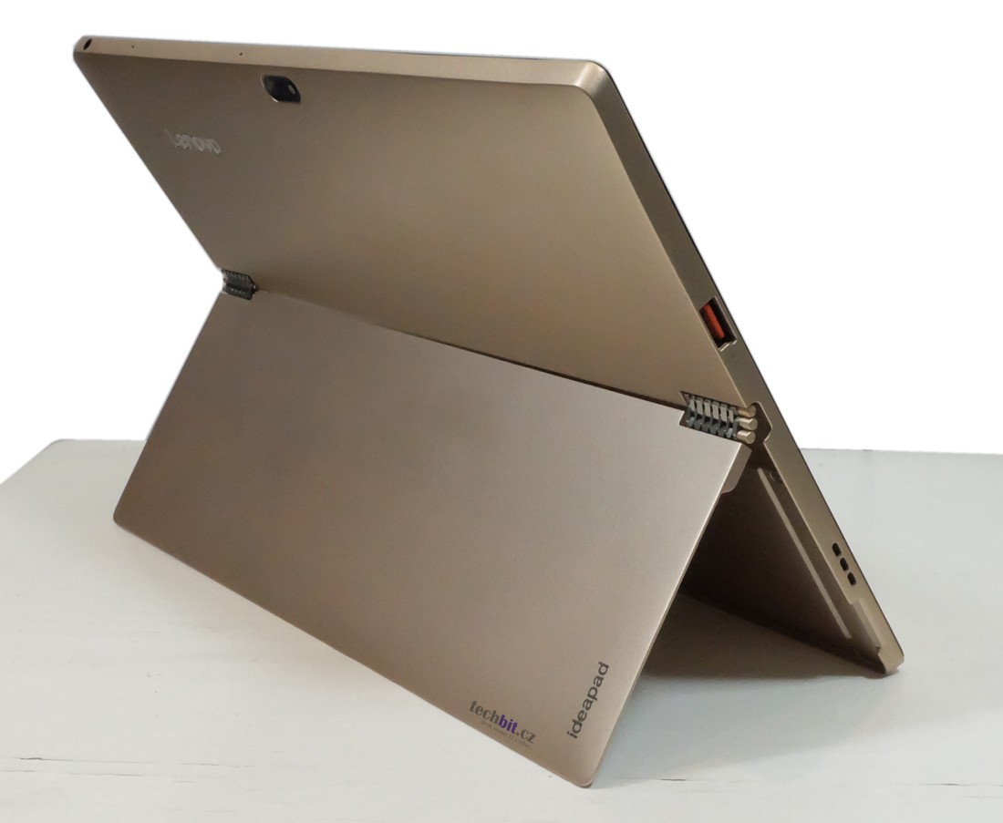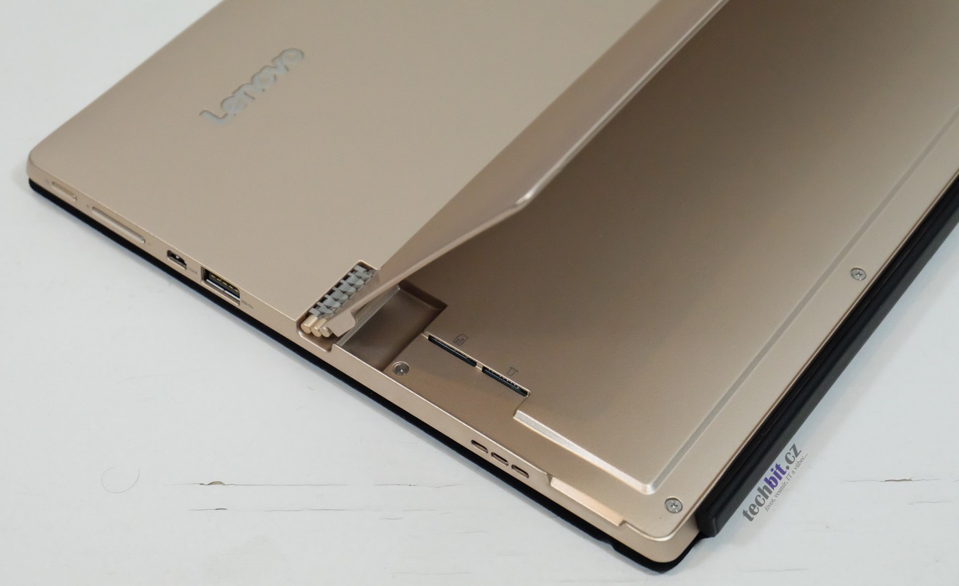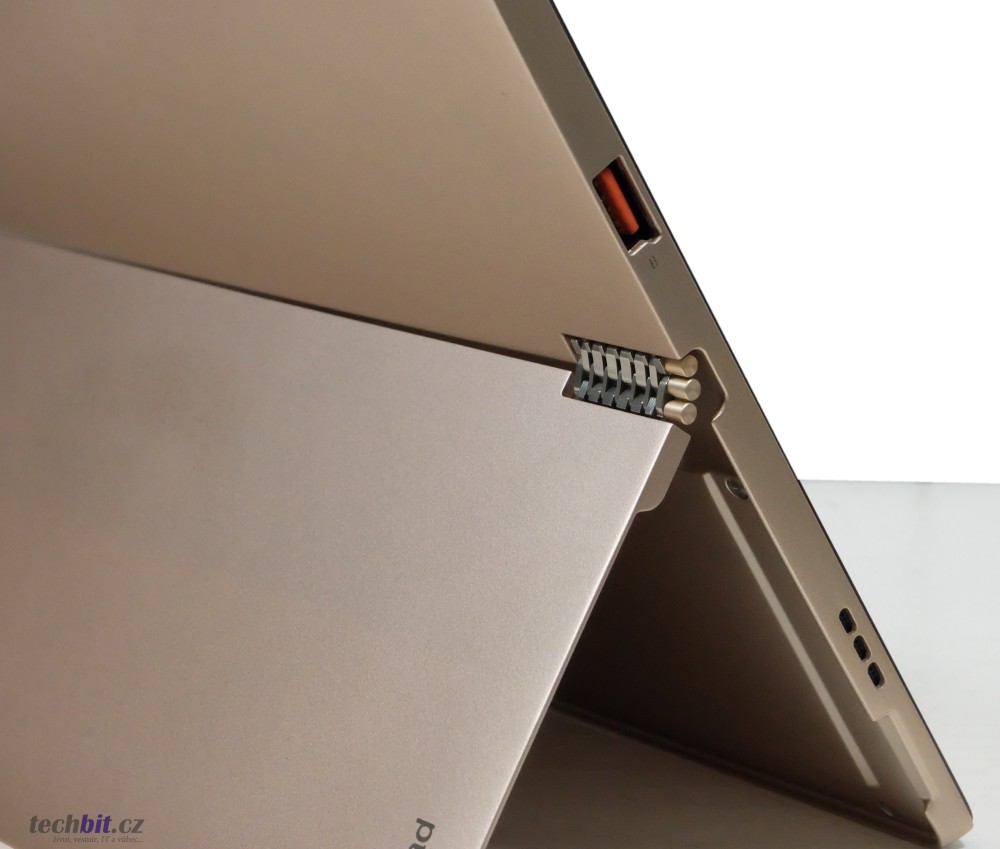 Zajímavě řešen je pant stojánku tabletu. Na webu Lenova píší, že je inspirován páskem hodinek. Možná na tom něco bude. Líbí se mi to a podobný pant je i na dalších produktech od Lenova. Trochu mám obavu, že časem povolí, ale to během pár dní testování neposoudím.