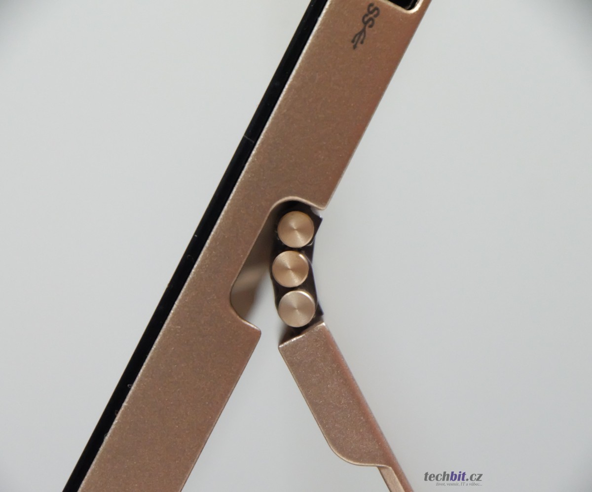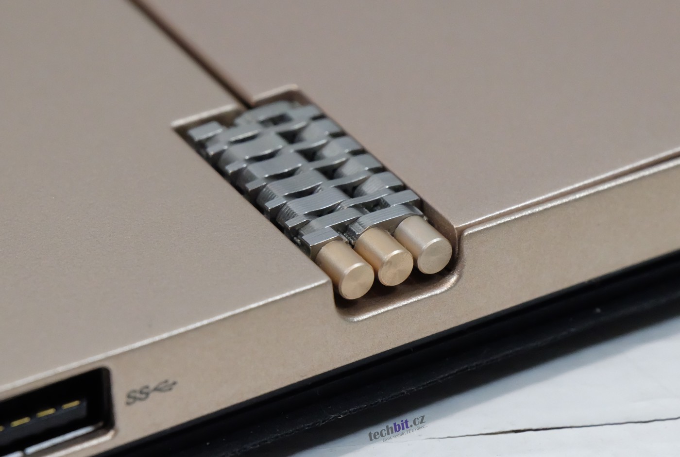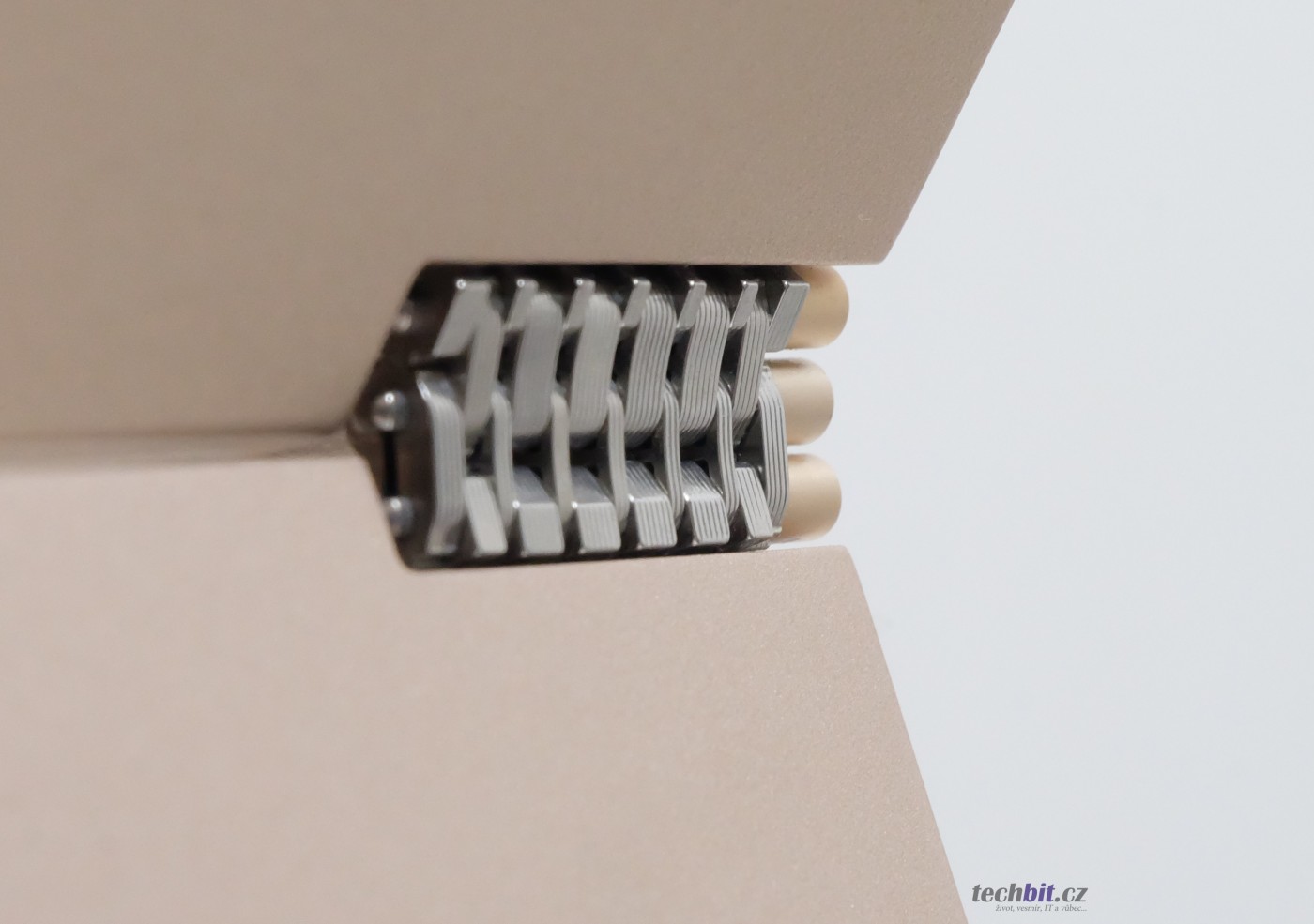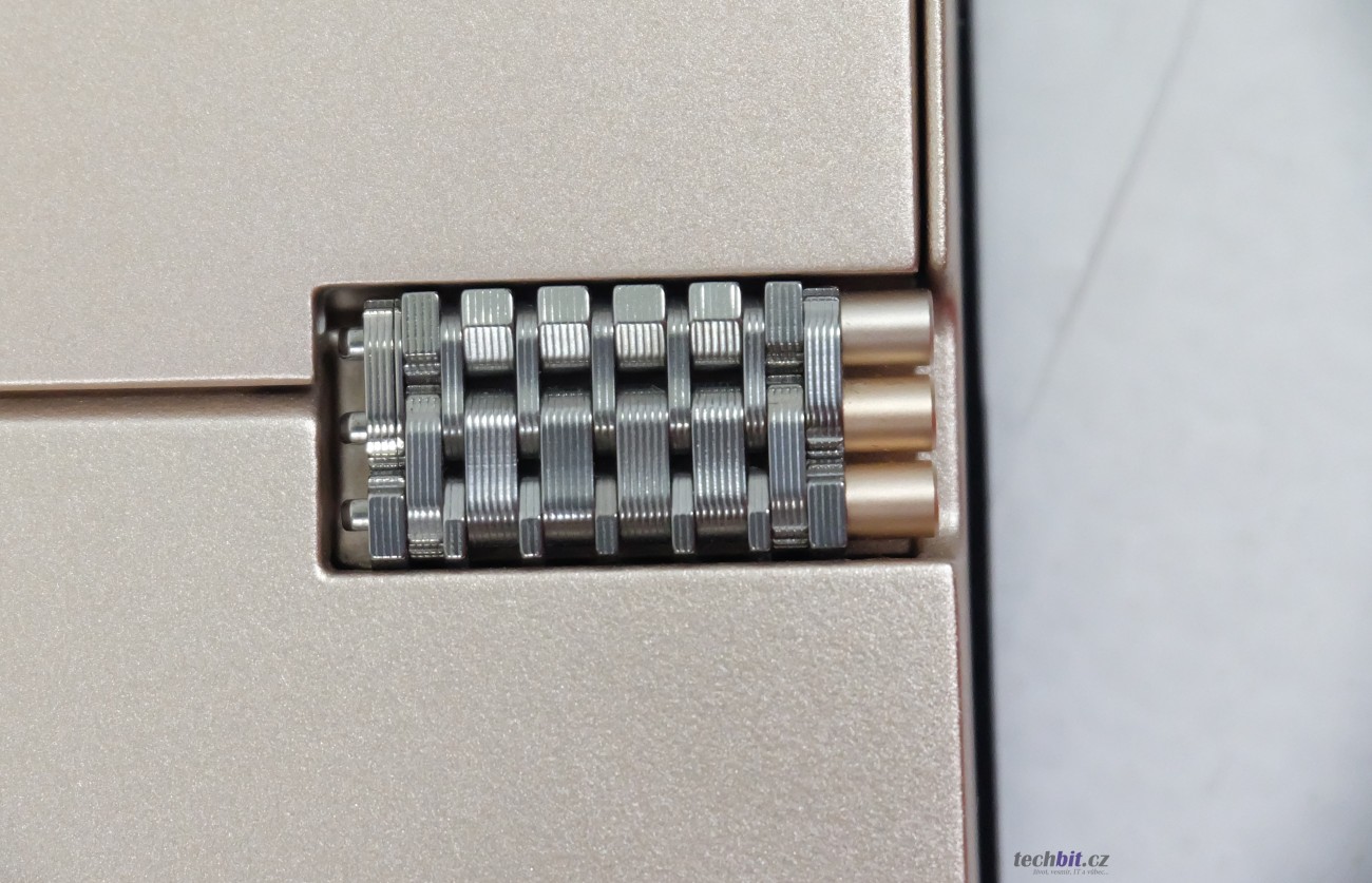 Zajímavě řešen je pant stojánku tabletu. Na webu Lenova píší, že je inspirován páskem hodinek. Možná na tom něco bude. Líbí se mi to a podobný pant je i na dalších produktech od Lenova. Trochu mám obavu, že časem povolí, ale to během pár dní testování neposoudím.