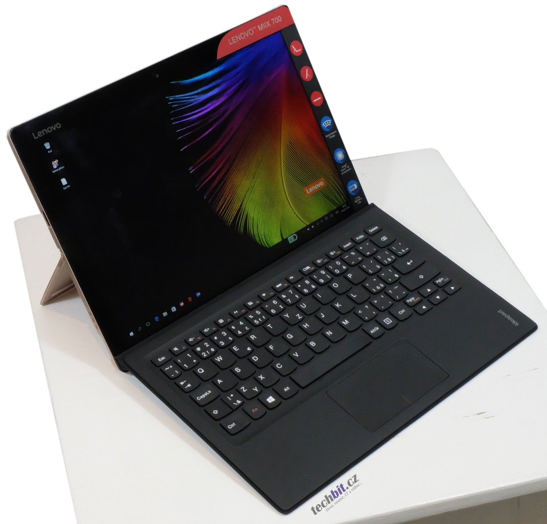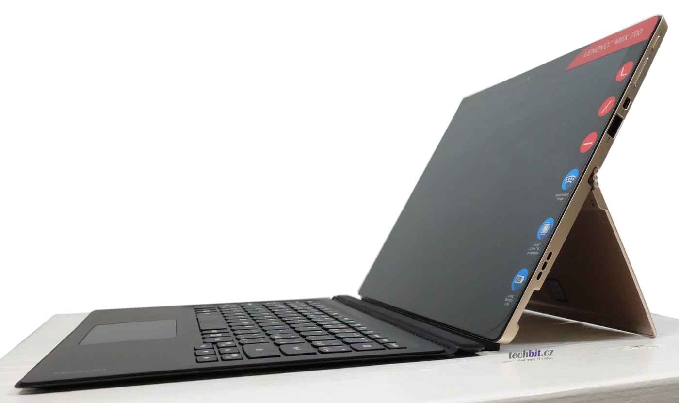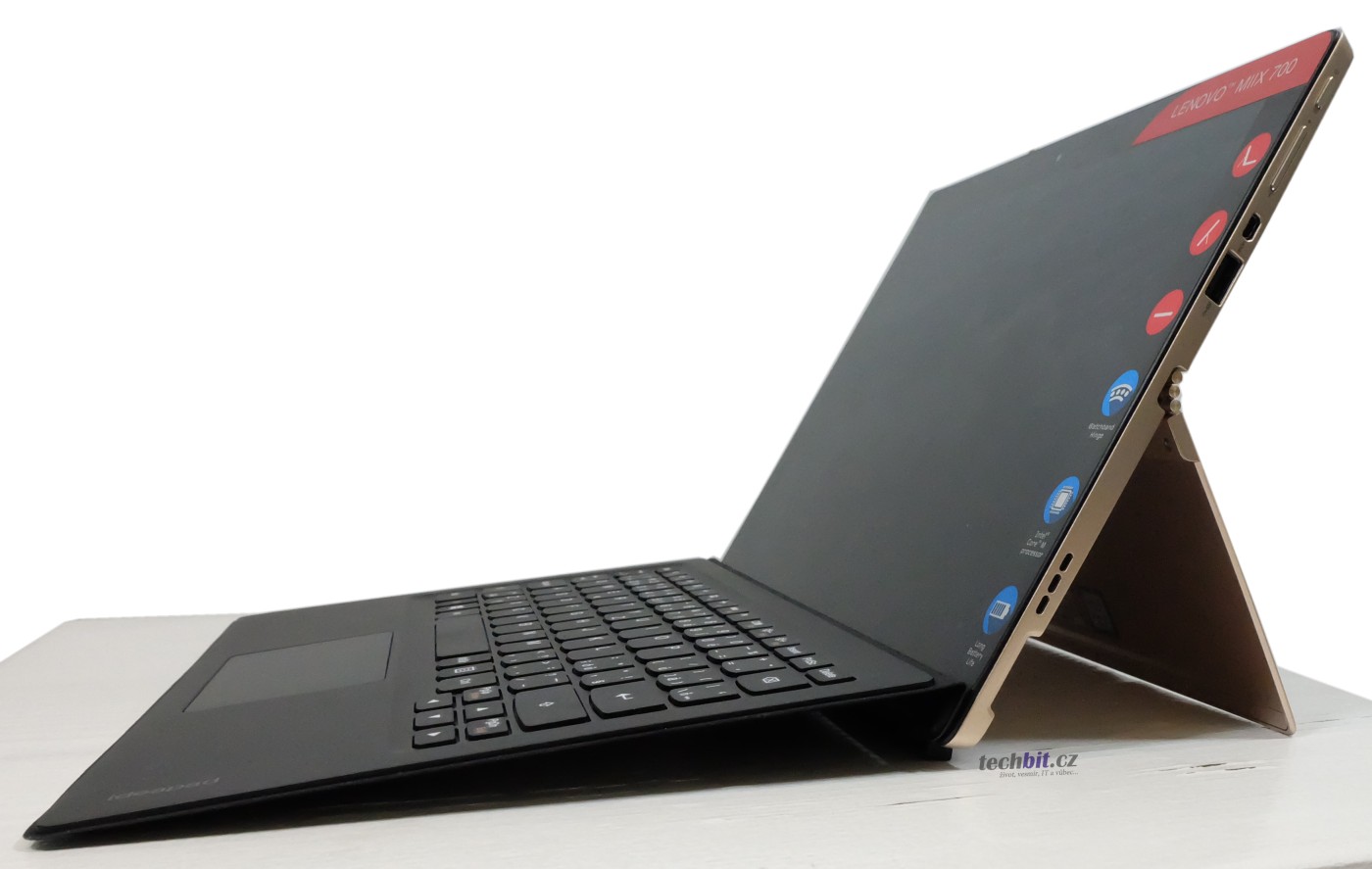 Kdo trochu sledujete dění, tak mu už určitě došlo, že Lenovo Miix 700 je zařízení typu Surface. Tablet se stojánkem, úzká klávesnice plnící také funkci pouzdra. Stojánek nebo podpěrka mi přijde u Miix 700 trochu fórová, opravdu hodně tenká. Při troše nešikovnosti bych se bál, že ji snadno deformuji.