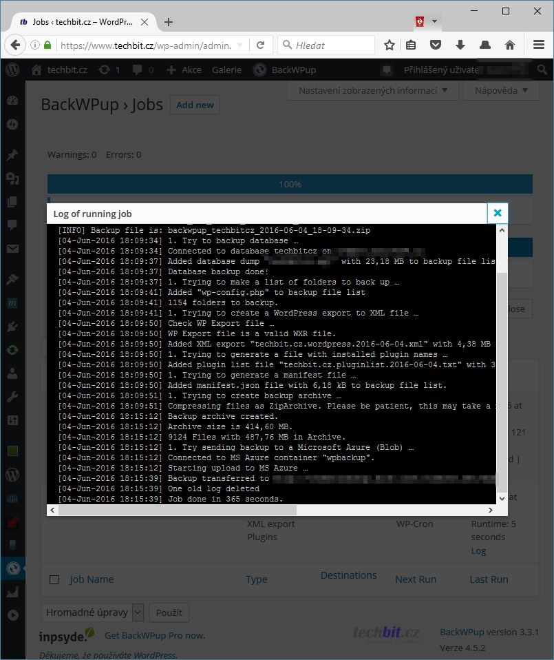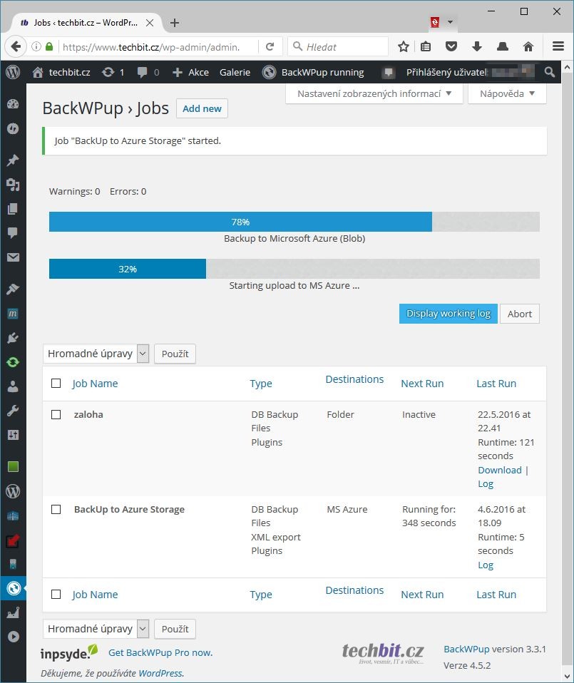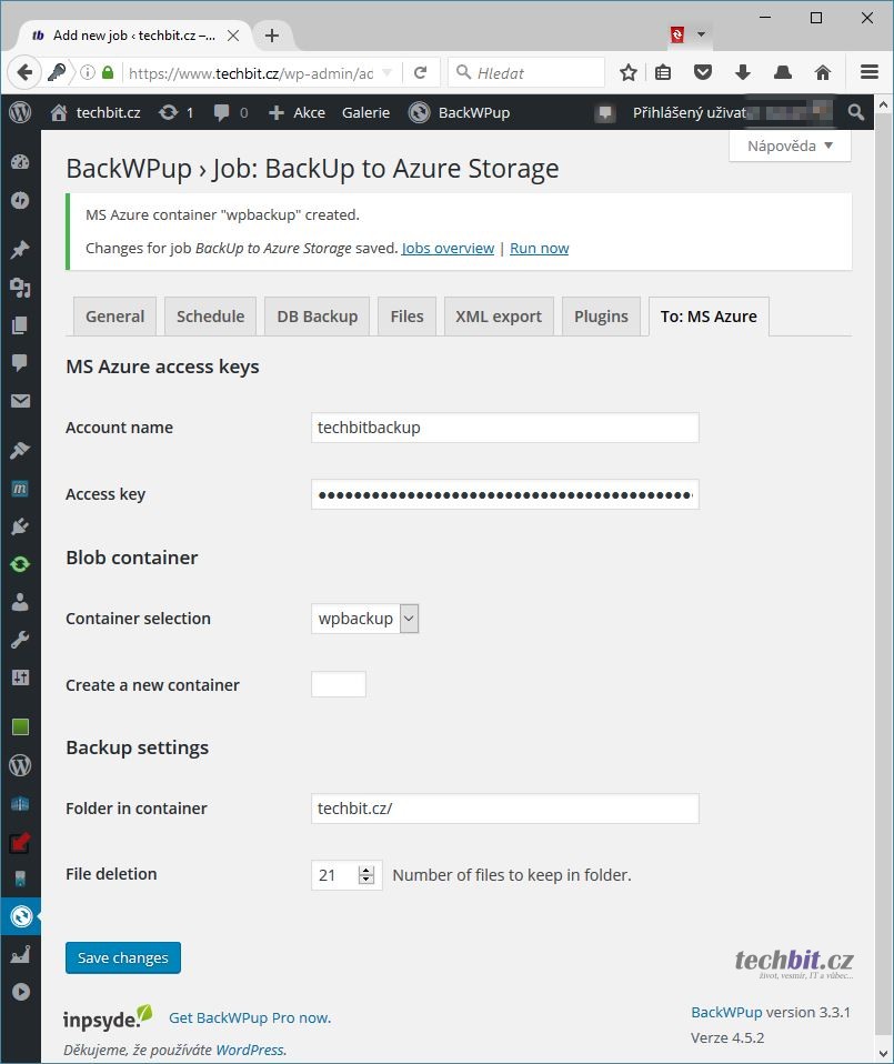 Jak jistě poznáte, techbit.cz také běží na WordPressu a zálohuji ho do Azure Storage. Na straně WordPressu k tomu stačí plugin, který vše zařídí. Používám BackWPup, umí toho opravdu hodně už v základu, který je zadarmo. Pokud tento plugin ještě nemáte, najděte a nainstalujte přes administraci svého WordPressu. Poté jděte do ovládacího rozhraní pluginu a přidejte novou úlohu (Add new job), vyplňte, co je potřeba, a pro umístění zálohy zvolte Backup to Microsoft Azure (Blob). Vyplňte vše potřebné a v poslední záložce nastavení úlohy zadejte přístupové údaje k Azure Storage. Pak již můžete přejít v menu BackWPup na Jobs a úlohu spustit.