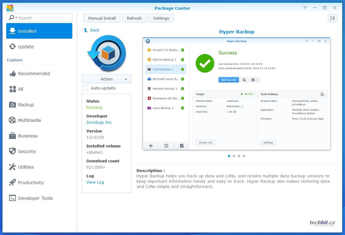 Vaše síťové úložiště Synology musí mít poslední verzi DSM (6.x) a nainstalovanou aplikaci Hyper Backup. Pokud není předinstalovaná, nainstalujte z Package Center.