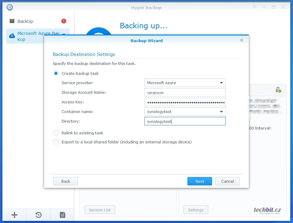 Tak zpět k Synology – ve webové administraci DSM si otevřete Hyper Backup a vytvořte Data backup task. V průvodci (Backup Wizard) vyberte Microsoft Azure a v dalším okně zvolte požadovanou úlohu. Předpokládám, že budete vytvářet první úlohu, takže Create backup task a vyplňte vše potřebné. Volba Relink to existing task umí navázat na dřívější zálohu v Azure (vytvořenou přes Synology) a třetí volba umí export zálohy třeba na externí disk.