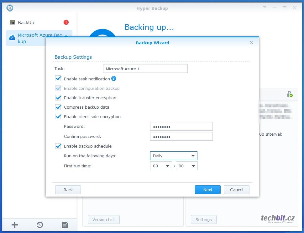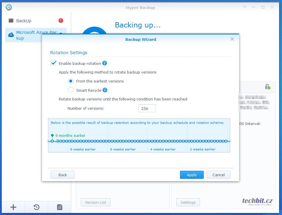 V dalším kroku zvolte jaká data a aplikace budete zálohovat. Předposlední krok umožňuje detailní nastavení úlohy. Doporučuji zapnout šifrovaný přenos dat (Enable transfer encryption) a šifrování na straně Synology (Enable client-side encryption). Šifrování může více zaměstnávat procesor zařízení, ale doba zálohování je zpravidla v noci, takže to uživatelé nemusí vůbec pocítit. Heslo k šifrování neztratit (nebo si bezpečně uložit šifrovací klíč, který se po vytvoření úlohy stáhne)! Posledním krokem v průvodci je nastavení rotace záloh, je to šikovná věc a doporučuji ji mít zapnutou (Enable bacukp rotation). Kliknutím na tlačítko Apply dokončíte nastavení a úloha se vytvoří. Můžete ji třeba rovnou spustit.