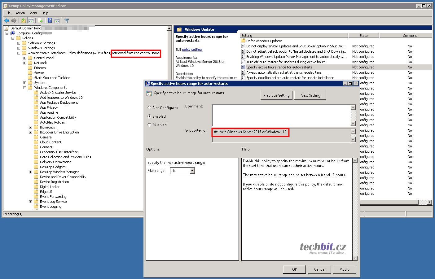 Balíček nainstalujte a celou složku PolicyDefinitions zkopírujte do Central Store na DC (C:\Windows\sysvol\domain\Policies). Ze složky PolicyDefinitions můžete klidně vymazat jazyky, které se ve vaší síti nevyskytují a ponechat jen používané (např. en-US, cz-CS). Když nově otevřete Group Policy Management a budete editovat nějakou politiku, šablona bude načtená z Central Store a obsahuje aktuální možnosti pro poslední operační systémy.