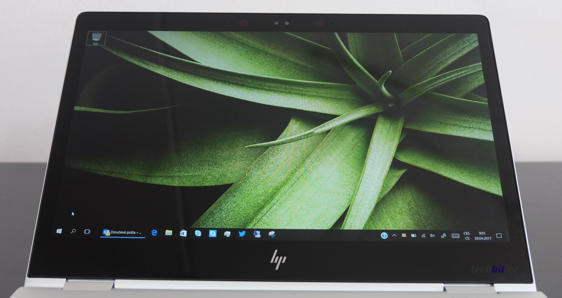 Komplet kovové tělo znamená samozřejmě i kvalitní kovové panty displeje. Panty jsou dvojité, aby bylo možné displej úplně překlopit. Drží dobře v každé pozici a snad by to mělo vydržet i při častém používání. Rovnou přejdu k displeji – testovaný EliteBook má dotykový, tenký 13,3″ displej (UWVA IPS) s rozlišením FHD (1920 x 1080 bodů). Dělá se i vyšší (4K), ale tohle rozhodně stačí. Navíc vyšší rozlišení znamená vyšší spotřebu energie. Doporučené měřítko pro FHD na 13,3″ ve Windows 10 je 150%. Já jsem shledal jako nejoptimálnější 125%. Kvalitě displeje a dotykovému ovládání není co vytknout. Jsou tu jen dvě věci, které mohou být pro mnoho zájemců o koupi rozhodující. Je to lesklý displej – je opravdu extra lesklý. Při práci zády k oknu musí být jas displeje naplno, aby šlo nerušeně pracovat. Je to také o zvyku, po těch 14 dnech už mi to skoro nepřišlo. Druhý neduh je upatlaný displej. Na lesklém displeji to opravdu velmi vyniká. Takže utěrku z mikrovlákna vždy u sebe!
