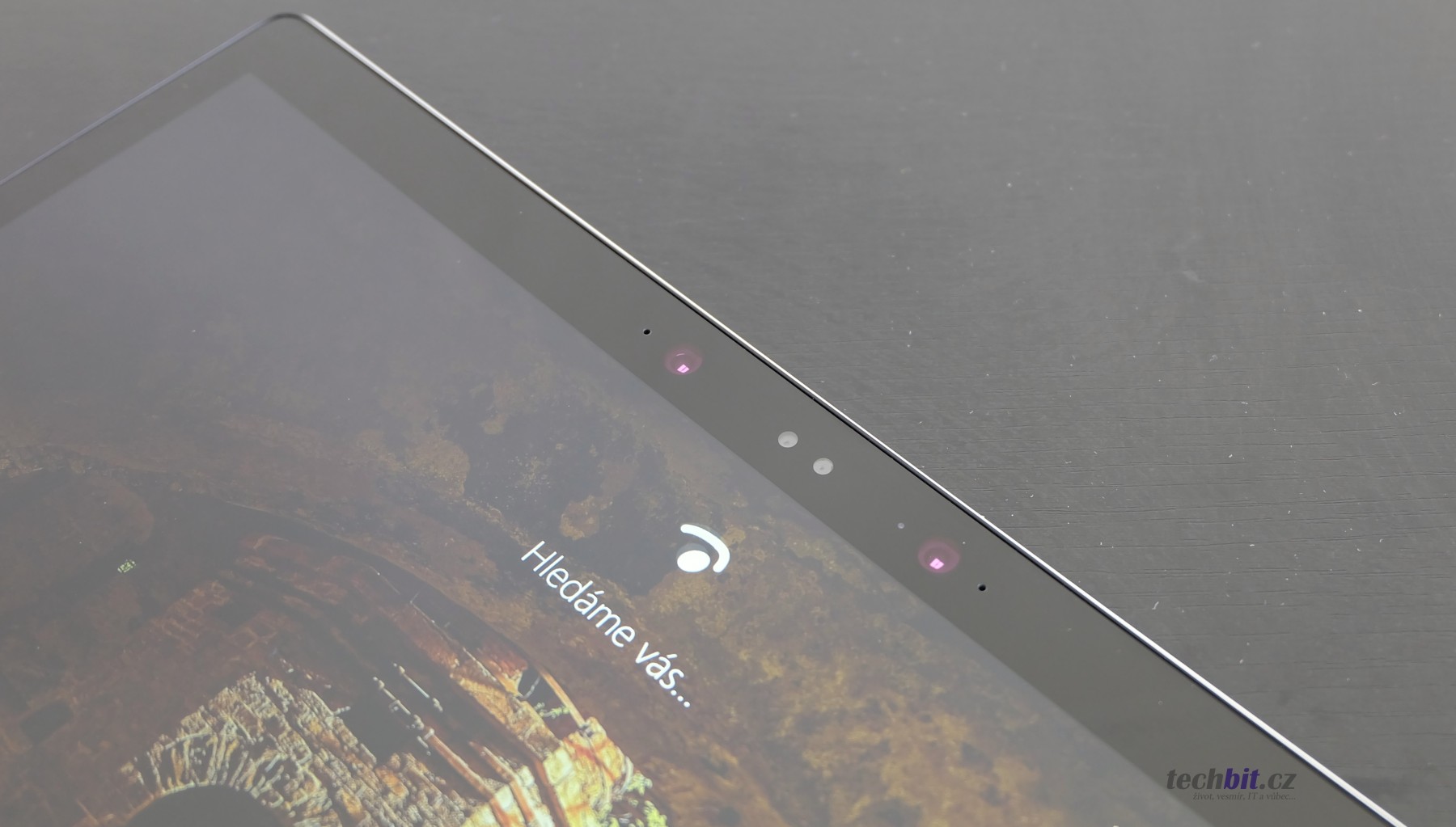 V rámu displeje se schovává jedna obyčejná webová kamera (720p) a hned vedle ní je infračervená kamera, která slouží k rozpoznávání obličeje a automatickému přihlášení do Windows 10 pomocí Windows Hello. Používat tento způsob ověření a přihlášení do systému je velmi návykové. Většinou je rozpoznávání velmi rychlé a nezdržuje. Pokud nastane problém, například kvůli nějakým rušivým světelným podmínkám, je tu ještě možnost použít dotykovou čtečku otisku prstů. Taktéž funguje bezvadně a spolupracuje s Windows Hello. IR kamera a čtečka fungují, i když je displej převrácen. Klávesnice a touchpad jsou v této poloze neaktivní.