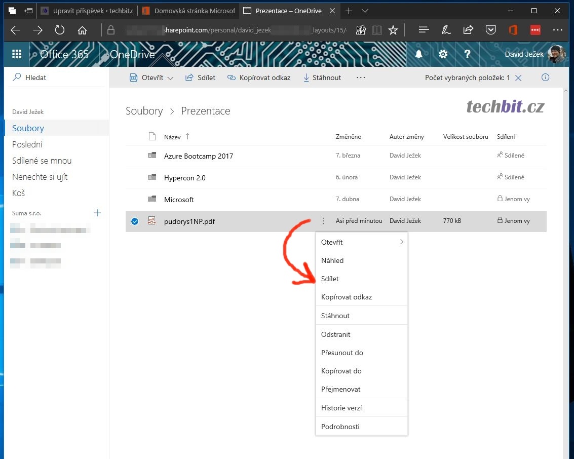 Najděte si dokument nebo soubor, který budete chtít sdílet (pokud tam soubor ještě nemáte, tak si ho na OneDrive uložte). Klikněte na možnosti (tři tečky) a zvolte Sdílet.