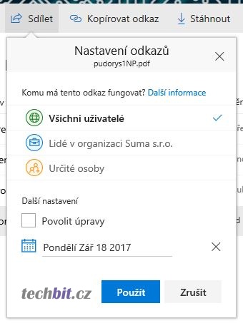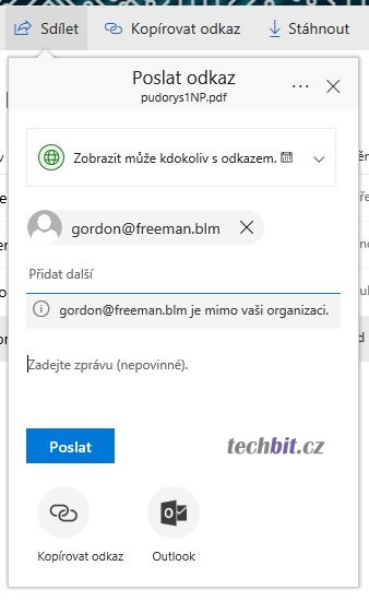 V okně pro sdílení je řada možností. Dokument je možné sdílet v rámci vaší organizace, pro všechny (kdo má odkaz) nebo jen určitým osobám. Zvolte podle vlastních potřeb. Je vhodné nastavit také exspiraci odkazu nebo zakázat úpravy dokumentu. Pomocí okna pro sdílení je možné odkaz rovnou poslat nebo ho můžete zkopírovat do schránky a vložit do zprávy v Outlooku.