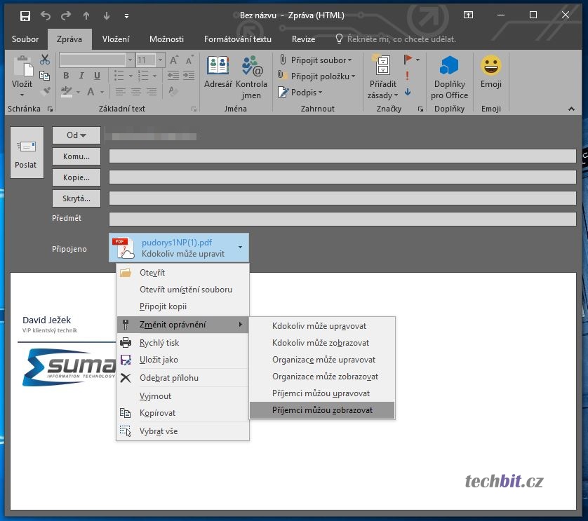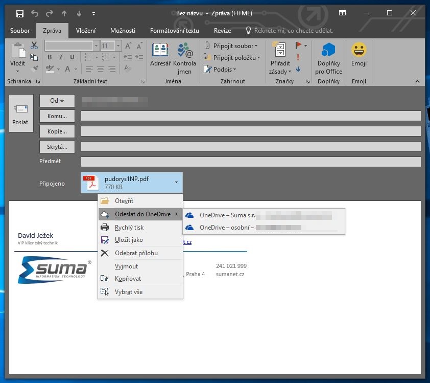 V Outlooku zvolíte novou zprávu a připojíte přílohu. Přílohu odešlete na OneDrive pro firmy a zvolíte si potřebné oprávnění. V emailové zprávě se odešle jen odkaz na dokument, který bude fyzicky uložen na vašem OneDrive ve složce Přílohy.