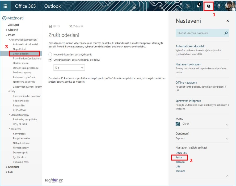 Možnost odložení odeslání najdete v Nastavení > Možnosti > Nastavení vašich aplikací > Pošta > Automatické zpracování > Zrušit odeslání.