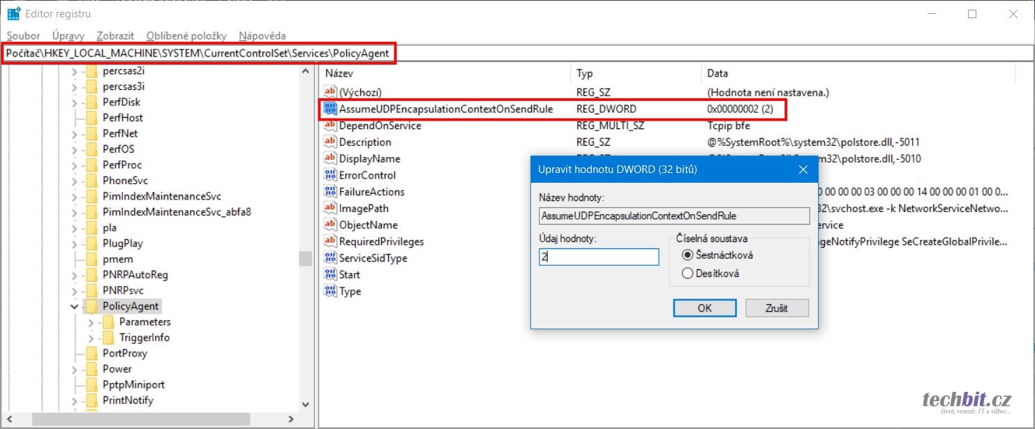 Otevřete si registry (Regedit) a najděte větev Počítač\HKEY_LOCAL_MACHINE\SYSTEM\CurrentControlSet\Services\PolicyAgent. Přidejte novou hodnotu DWORD a pojmenujte ji AssumeUDPEncapsulationContextOnSendRule. Nastavte této položce hodnotu na 2.