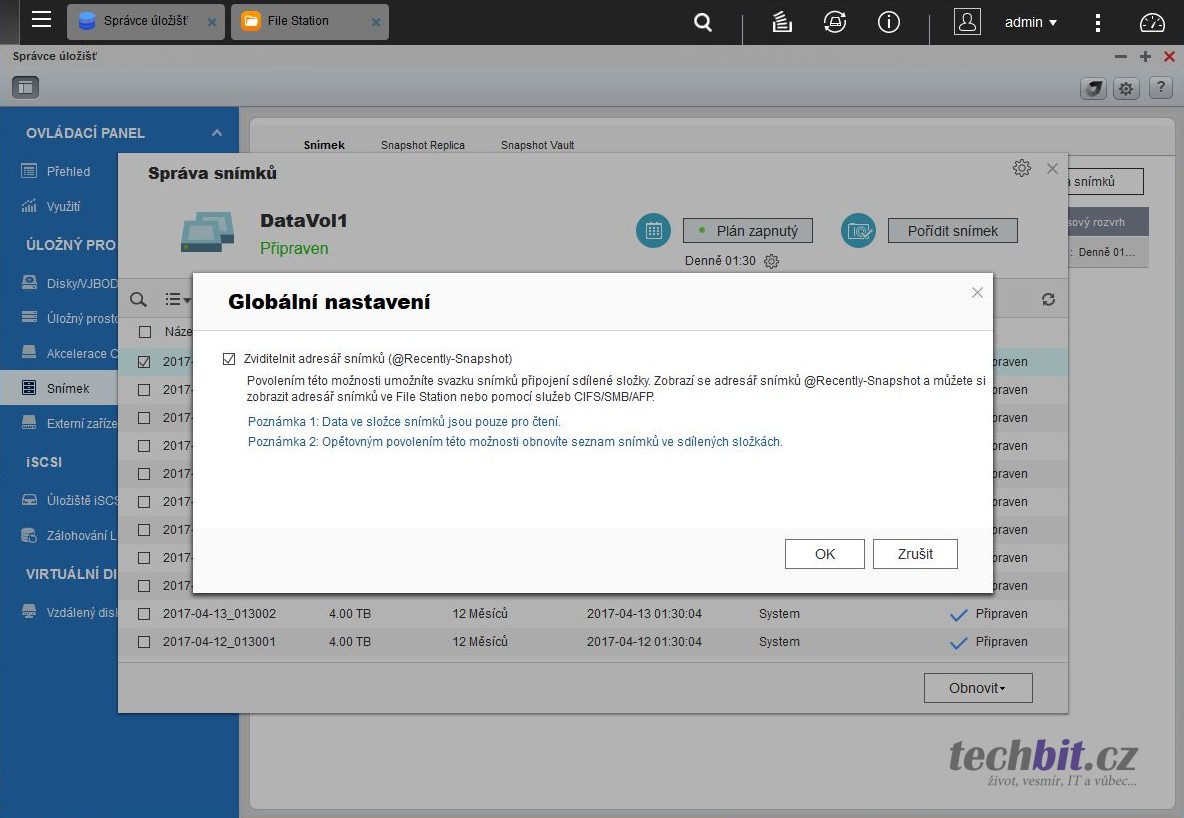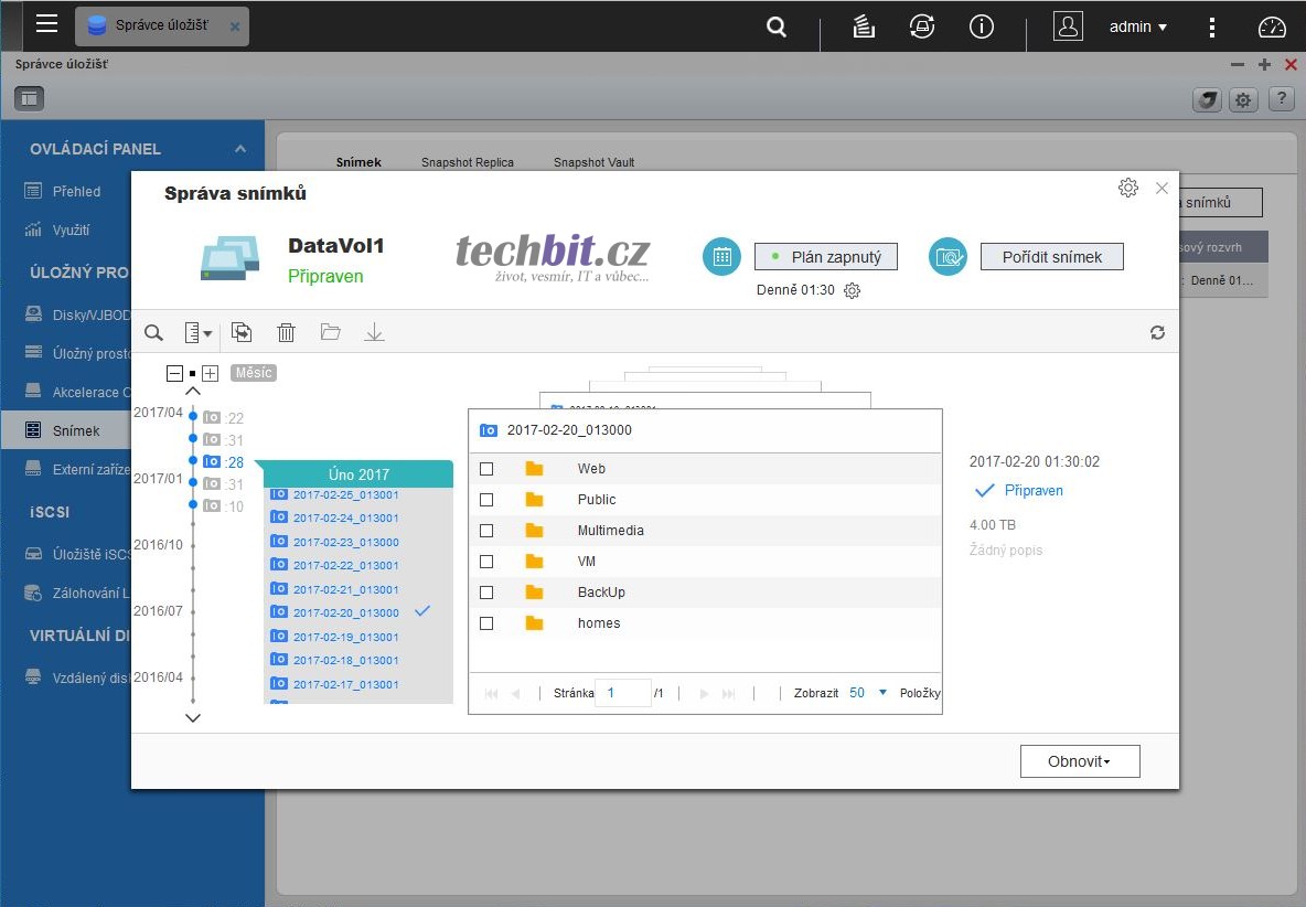 Správce úložišť umí lépe procházet snímky na časové ose. Časová osa je fajn, její ovládání je ale trochu kostrbaté. Lze se přepnout na obyčejný seznam. Složky snímků (@Recently-Snapshot) je možné zobrazit ve složkách a mít k nim přístup třeba přes File Station.