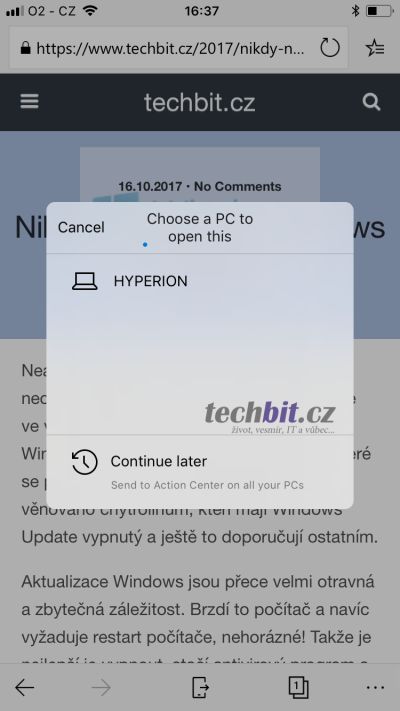 Tou zásadní novinkou související s prohlížečem MS Edge je aplikace Continue on PC pro Android a iOS. Aplikace umožní poslat si otevřenou webovou stránku z mobilního telefonu do počítače s Windows 10 (pokud je spárován přes MSA). Buď se stránka rovnou otevře v prohlížeči nebo se odloží do centra akcí. Odkud lze stránku později otevřít.