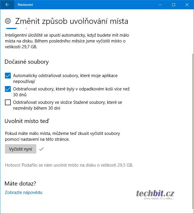 Systém > Inteligentní úložiště – umožňuje nově automaticky odstranit soubory ve složce Stažené soubory a odstranit předchozí verze Windows.