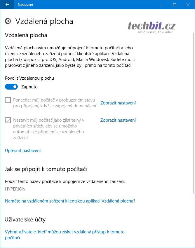 Systém > Vzdálená plocha – povolit vzdálenou plochu lze již z nového Nastavení, ale zároveň tato volba nezmizela z původního nastavení v ovládacích panelech a nastavení systému.