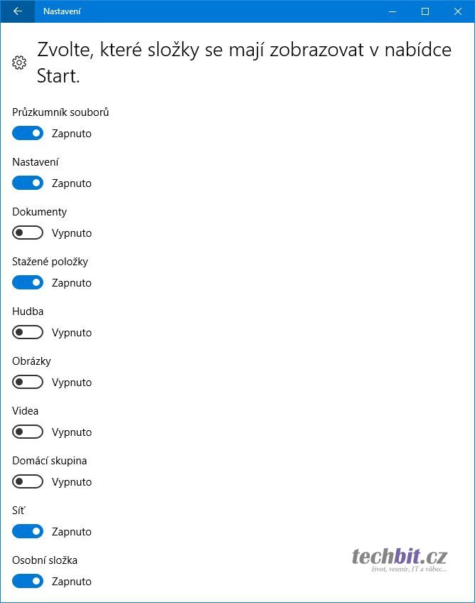 Přizpůsobení > Start > Zvolte, které složky se mají zobrazovat v nabídce Start – nové možnosti pro zobrazení odkazů ve nabídce Start.