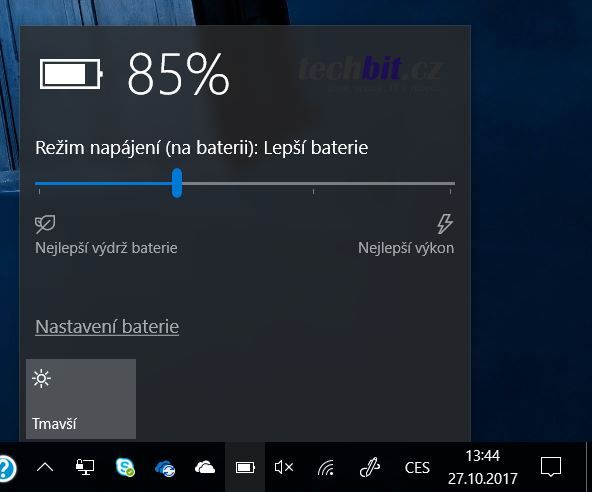 Po kliknutí na ikonu baterie v systémovém tray lze rychle upravit režim napájení. Například optimalizovat pro lepší výdrž baterie bez nutnosti otevírat nastavení napájení v ovládacích panelech.