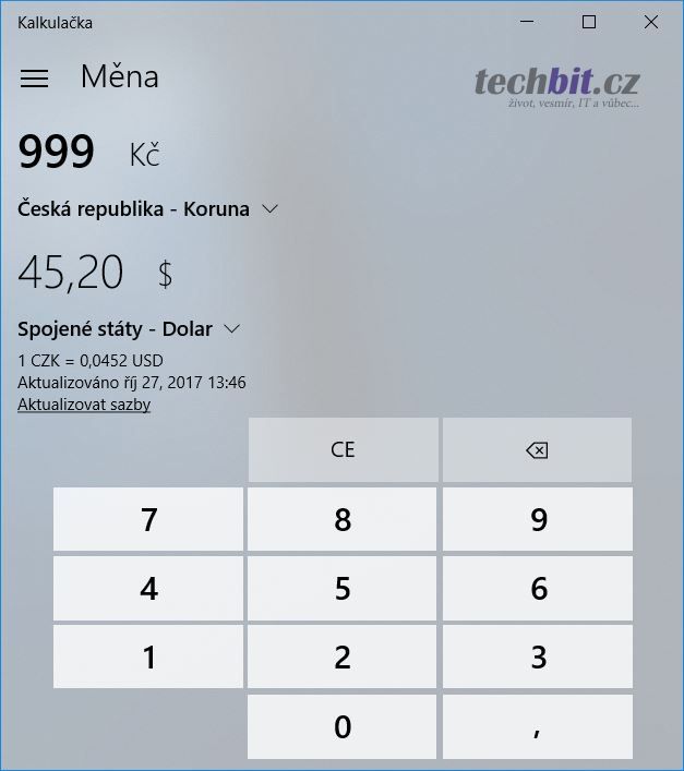 Přímo v kalkulačce je možné převádět měnu (sazby se aktualizují z internetu). Výběr měn není úplně šikovný. Musí se hledat a rolovat, ale funkci to nakonec splní.