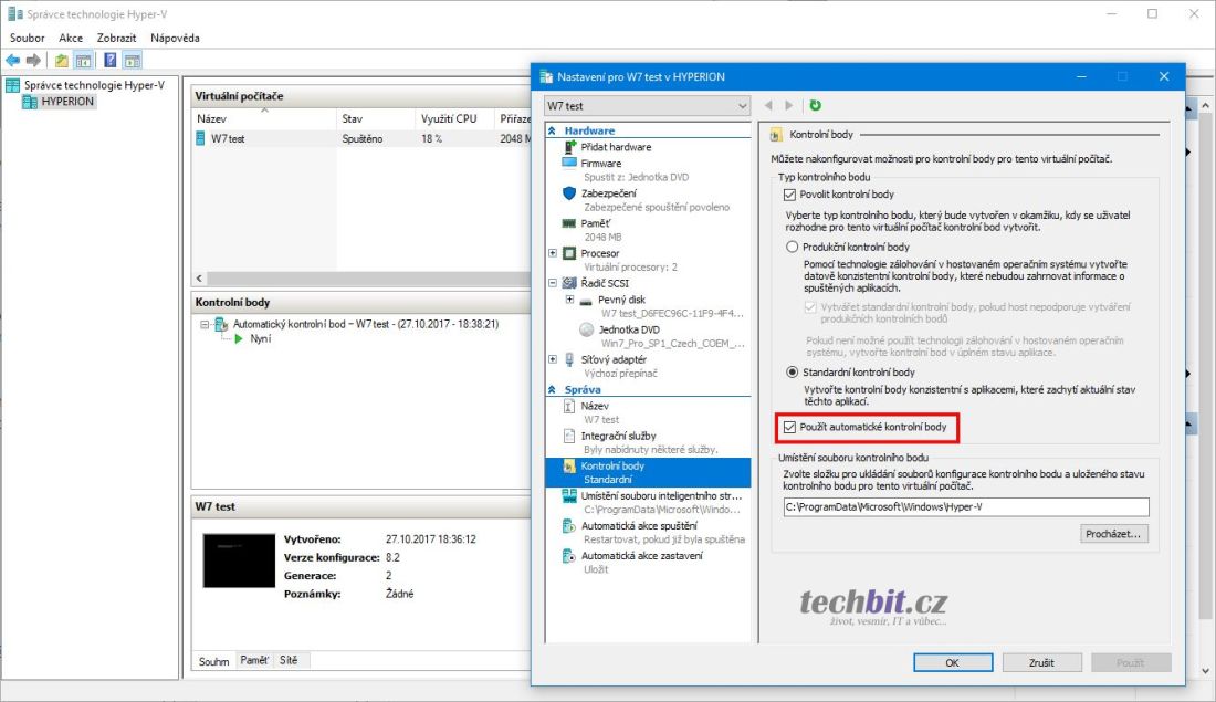 Můj oblíbený hypervizor Hyper-V se v podzimní aktualizaci dočkal také pár novinek. Je vylepšen rychlý průvodce pro vytvoření nového virtuálního stroje. Verze konfigurace virtuálního počítače se posunula na 8.2. Hyper-V nyní umí vytvářet automatické kontrolní body (Checkpoints). Virtuální stroj si umí „sáhnout“ na napájení hypervizoru. Pokud virtualizujete například na notebooku nebo máte připojen záložní zdroj s baterií, tak si VM dokáže zjistit stav baterie. Je třeba ale vytvořit VM přes powershell s parametrem -Prerelease. Bohužel se mi tohle nepodařilo otestovat, budu se tomu věnovat někdy v budoucnu. Virtuální počítač je možné exportovat pomocí tlačítka sdílet a snadno tak přenést konfiguraci na jiný Hyper-V stroj.