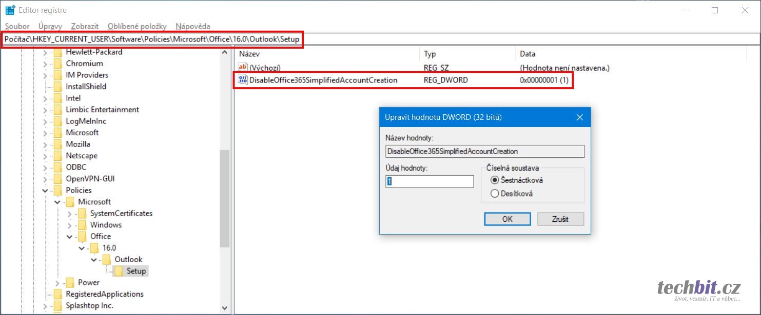 Otevřete registry (Regedit) a najděte si větev HKEY_CURRENT_USER\SOFTWARE\Policies\Microsoft\Office\16.0\Outlook\setup. Pokud chybí Office\16.0\Outlook\Setup, tak je vytvořte. Zde vytvořte novou hodnotu DWORD a pojmenujte DisableOffice365SimplifiedAccountCreation. Přidejte této položce hodnotu 1.