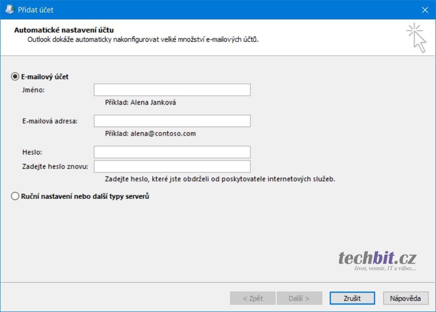 Pokud máte aktualizované verzi Microsoft Office, tak při vytváření nového účtu v aplikaci Outlook 2016 vyskočí jednoduchý průvodce, vyžadující od vás jen emailovou adresu, volbu služby a heslo. Další konfigurace proběhne zcela automaticky.