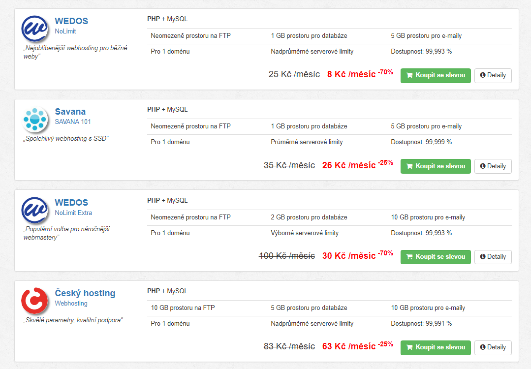 Nezapomeňte také sledovat slevové kupóny, které jsou na hosting k dispozici. Třeba tato 70% sleva na Wedos vám může zpříjemnit nakupování hostingu. Na portálu PromoKupon můžete prozkoumat i další slevy na webhosting.