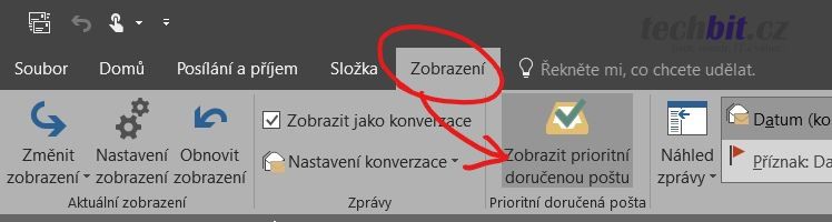 V aplikaci Outlook 2016 přejděte na Zobrazení a tam najdete tlačítko Zobrazit prioritní doručenou poštu.
