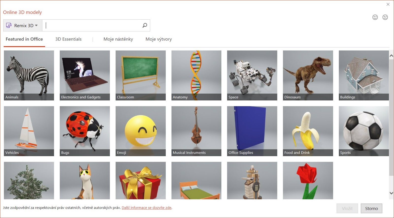 Zejména ze začátku ale bude asi vhodnější, když se podíváte po 3D modelech na internetu, konkrétně na portálu Remix 3D. A to je přesně to, odkud zobrazuje a nabízí modely i druhá položka v nabídce nazvaná „Z online zdrojů“.