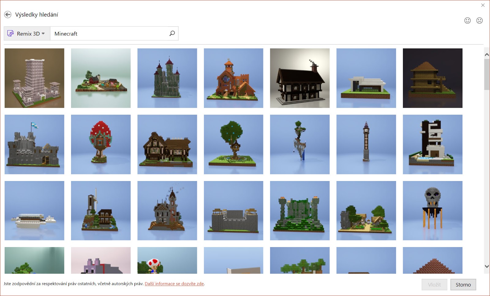 Jak vidíte, nabídka je opravdu pestrá a každý den navíc na portál Remix3D přibývají desítky nových modelů. Nabídka je rozdělena do základních kategorií jako jsou zvířata, učebna, rostliny a další. Nutno podotknout, že to, co vidíte na obrázku výše je pouze výběr některých zajímavých a používaných modelů, ale pokud hledáte něco konkrétního, stačí zadat požadovaný výraz do horního vyhledávacího pole. Všimněte si například, že ve výchozí nabídce není ani zmínka o modelech z populární hry Minecraft, ale jakmile dáte slovo Minecraft vyhledat, zobrazí se Vám stovky modelů.