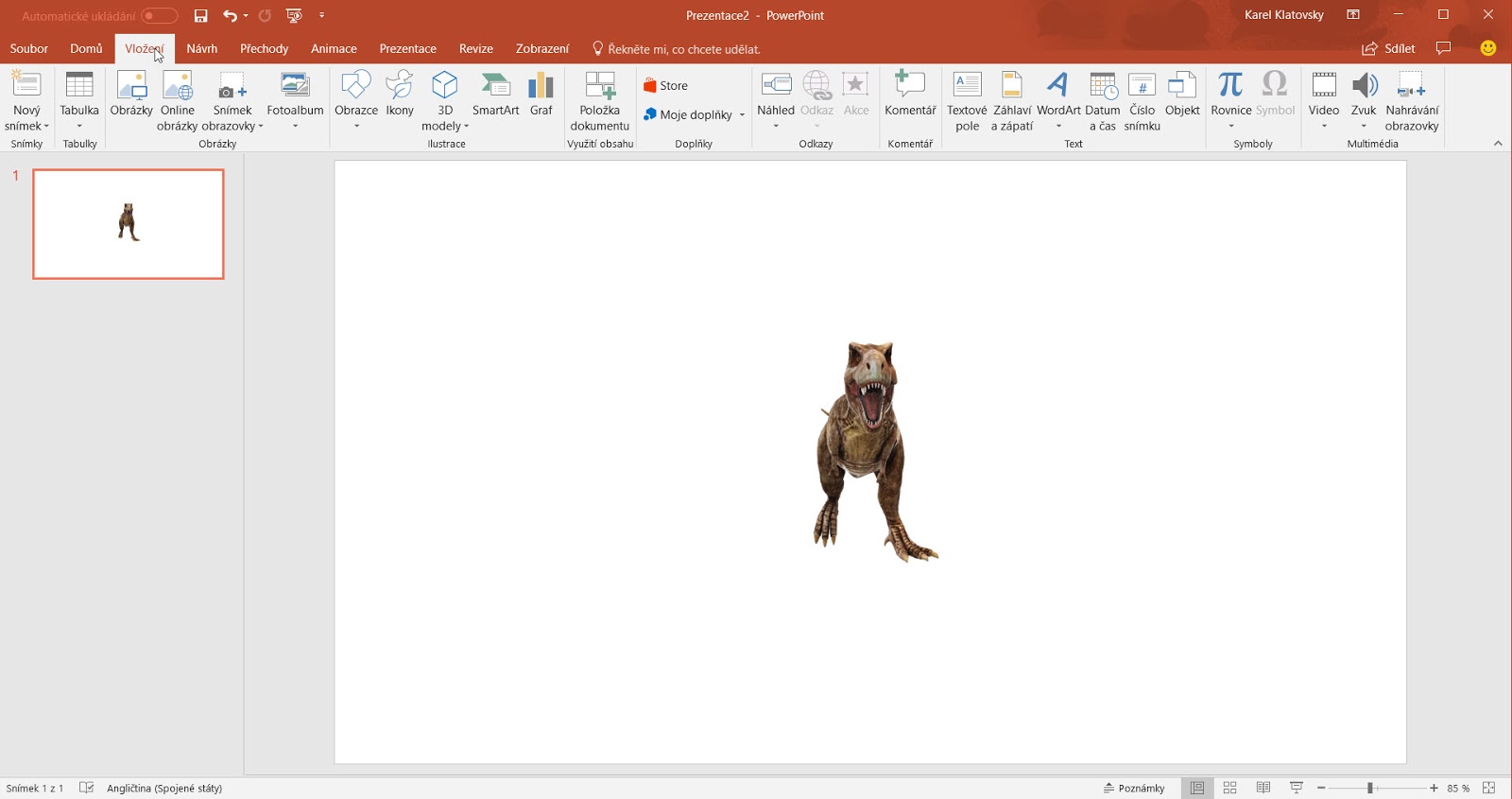 - Na 1. snímek prezentace si vložte model dinosaura. Můžete k němu také přidat případně i nějaké texty dle potřeby.