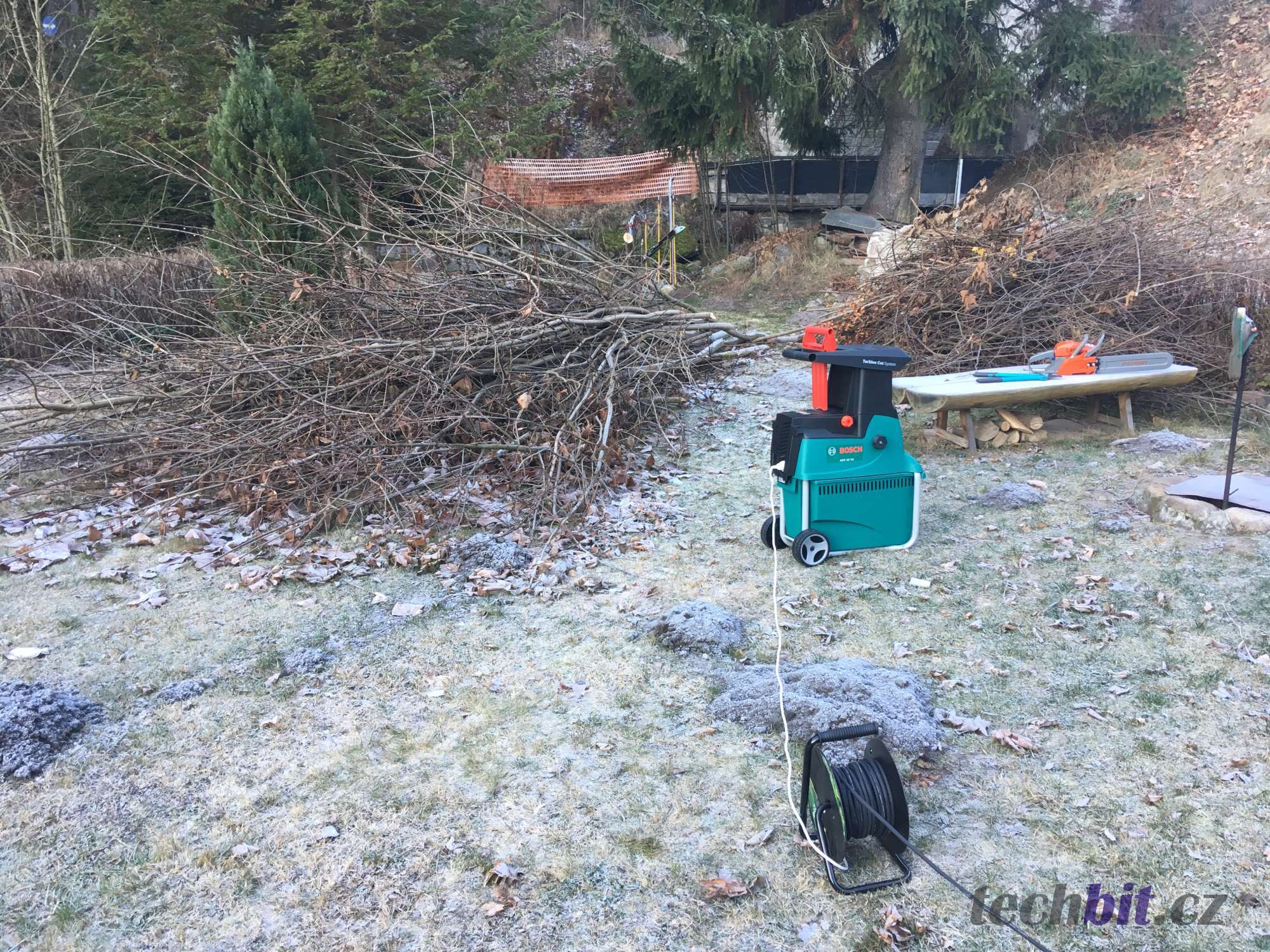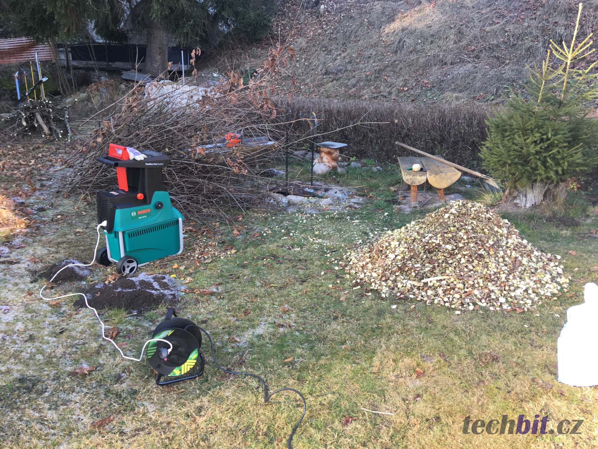 Když jsem štěpkovač vybíral, padnul mi do oka přístroj Bosch AXT 25 TC. Nemá klasické rychloběžné nože a ani drticí válec. Má turbínu s několika čepelí. Tedy turbína tomu říká Bosch, já si turbínu představuji trochu jinak, ale budiž. Přes pomalu otáčející se turbínu materiál prochází a větší větve to krásně chroupe. Není extra hlučný. Zvládne i tvrdé dřevo do průměru 45 mm. Jemné větvičky také dává, ale pokud jsou čerstvé zůstávají občas jen okousané a zlámané. Ale nijak velký problém jsem s tím neměl. Je dobré jemný materiál střídat s většími větvemi, ty průchod pročistí a nedochází k ucpání přístroje.